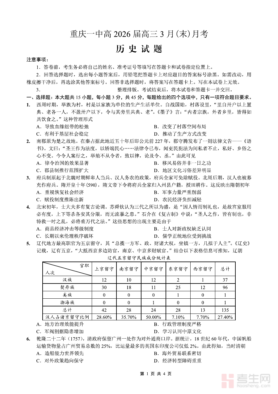 《重庆一中高2026届高三3月(末)月考 历史》是重庆地区重点中学重庆一中针对高2026届高三学生组织的历史学科阶段性月考资料。该考试处于高三下学期3月末的关键备考节点,是对学生进入高三以来历史知识积累与能力提升的系统性检验,能够客观反映学生当前的历史学习水平与备考状态,为后续高考复习计划的调整提供重要参考依据。