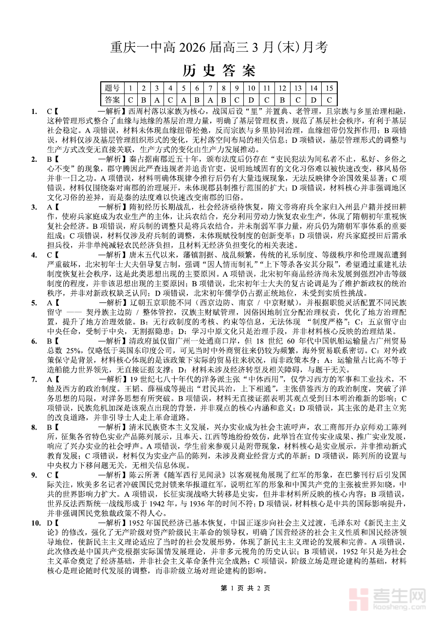《重庆一中高2026届高三3月(末)月考 历史答案》是重庆市第一中学校为高2026届高三学生3月末历史月考提供的配套参考答案资料。该资料紧密结合高三下学期3月这一高考备考关键阶段的检测需求,依托重庆一中的教学安排与阶段性评估标准,为师生提供了对应考试的标准化参考依据。作为重点中学的阶段性检测配套资源,它能够有效支撑师生对本次月考结果进行快速核对与反馈,是高三历史备考过程中不可或缺的阶段性辅助材料。