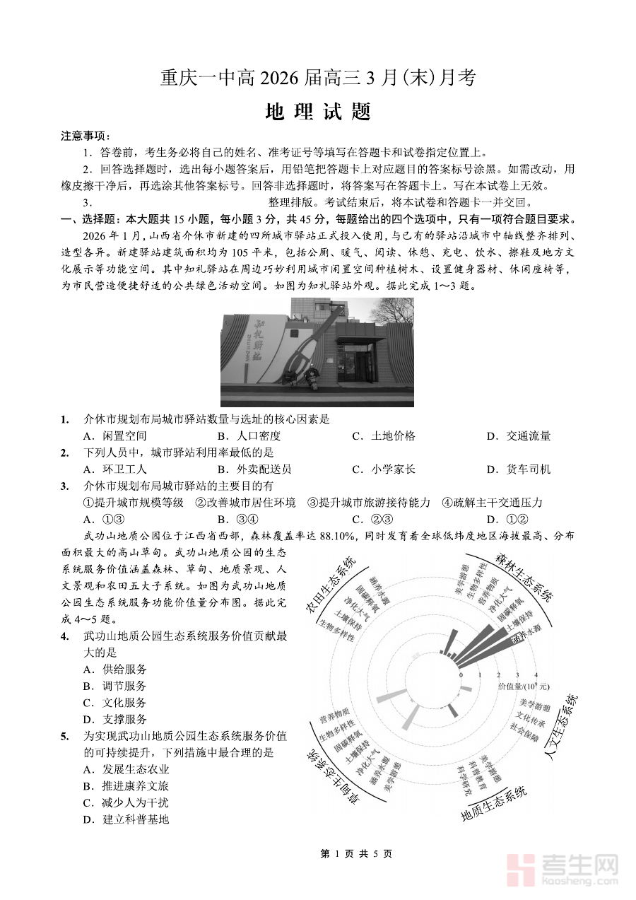 《重庆一中高2026届高三3月(末)月考 地理》是重庆一中针对高2026届高三学生组织的3月末阶段性地理学科考试资料,属于高三下学期重要的月考检测内容。作为重庆地区知名中学的备考资料,它紧密结合本地高考地理的教学要求与命题特点,能够为学生提供与本地教学节奏相匹配的阶段性检测素材,是高三地理备考过程中不可或缺的阶段性参考资料,有助于学生适应本地考试风格与难度梯度。