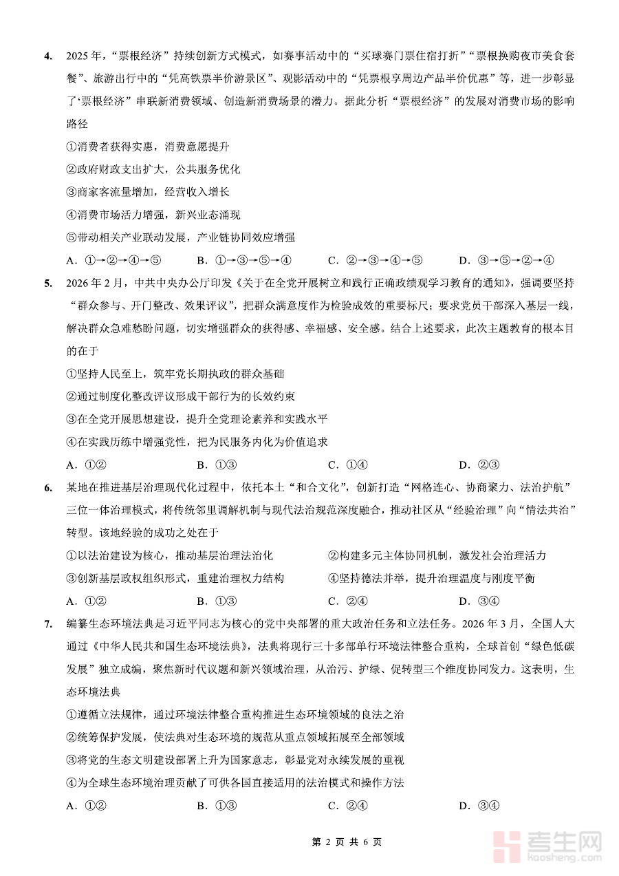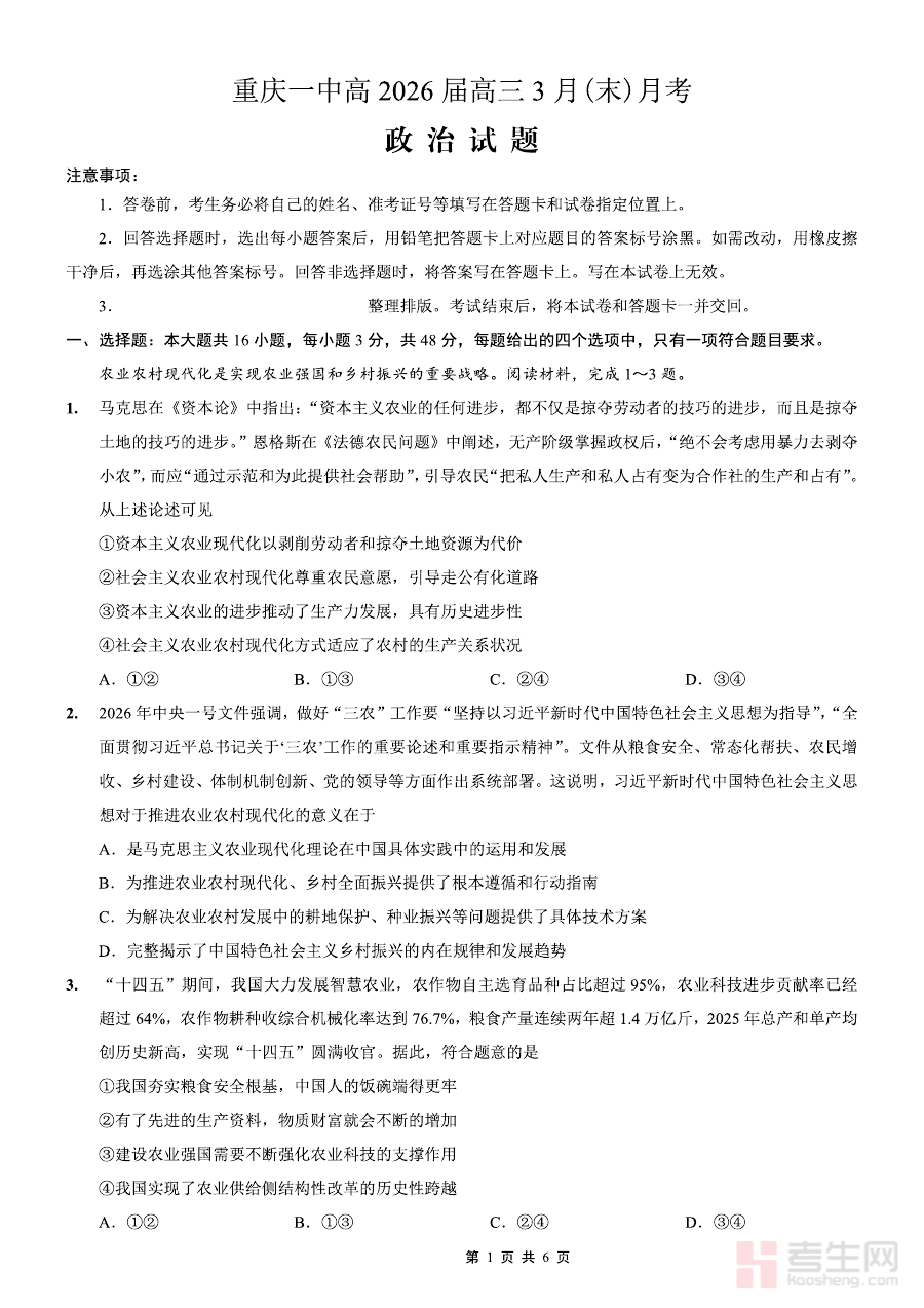 《重庆一中高2026届高三3月(末)月考 政治》是重庆一中针对高2026届高三学生组织的3月末政治学科校级月考相关备考资料。该资料结合重庆一中的教学进度与高三下学期初期的备考需求,聚焦政治学科的阶段性学习目标,是本届学生在高考前关键阶段的重要学习成果评估工具。它依托学校成熟的教学体系与检测标准,能够客观反映学生在该阶段对政治学科核心知识的掌握情况及应用能力水平,为后续备考提供基础参考。