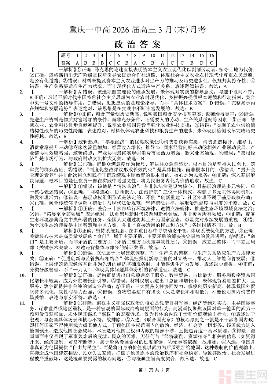 《重庆一中高2026届高三3月(末)月考 政治答案》是针对重庆市第一中学高2026届高三学生3月末月考政治科目的配套答案资料。该考试属于高三阶段重要的月度阶段性检测,由重庆一中结合高三备考节奏与政治学科教学进度设置,作为重庆地区知名中学的阶段性考试配套资料,其内容与该校教学要求紧密衔接,能够为学生提供该次月考政治科目的权威作答参考依据。