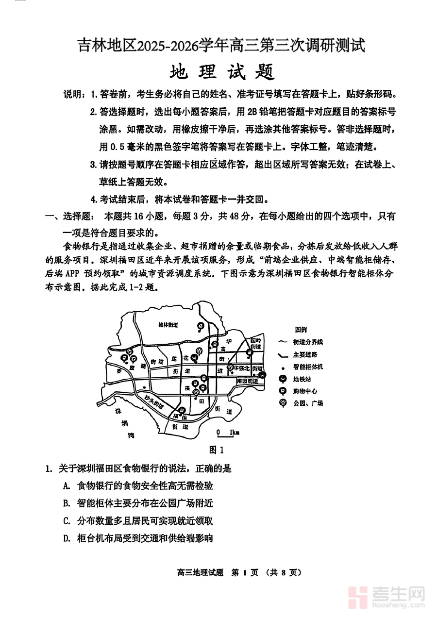 《地理-2026届吉林地区2025-2026高三下第三次调研测试(吉林三调)》是2025-2026学年下学期吉林地区针对2026届高三学生开展的第三次地理学科调研测试相关备考资料,该测试属于区域内重要的阶段性调研考试范畴,能够反映吉林地区高三地理教学的阶段进展与学生学习状况。