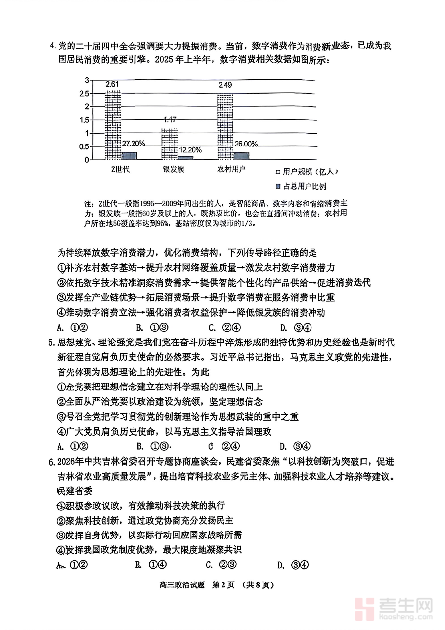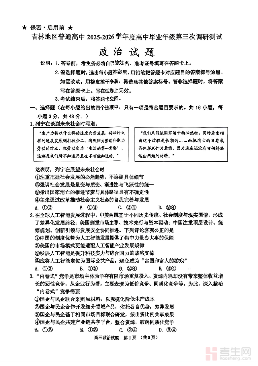 《政治-2026届吉林地区2025-2026高三下第三次调研测试(吉林三调)》是针对2026届吉林地区高三学生在2025-2026学年下学期开展的第三次区域调研测试的政治学科备考资料。该测试属于吉林地区高三阶段重要的阶段性检测项目之一,旨在通过统一命题与考核方式,反映该地区高三政治学科教学的阶段性成果及学生的知识掌握情况,为后续备考工作提供基础的数据支撑与方向参考。