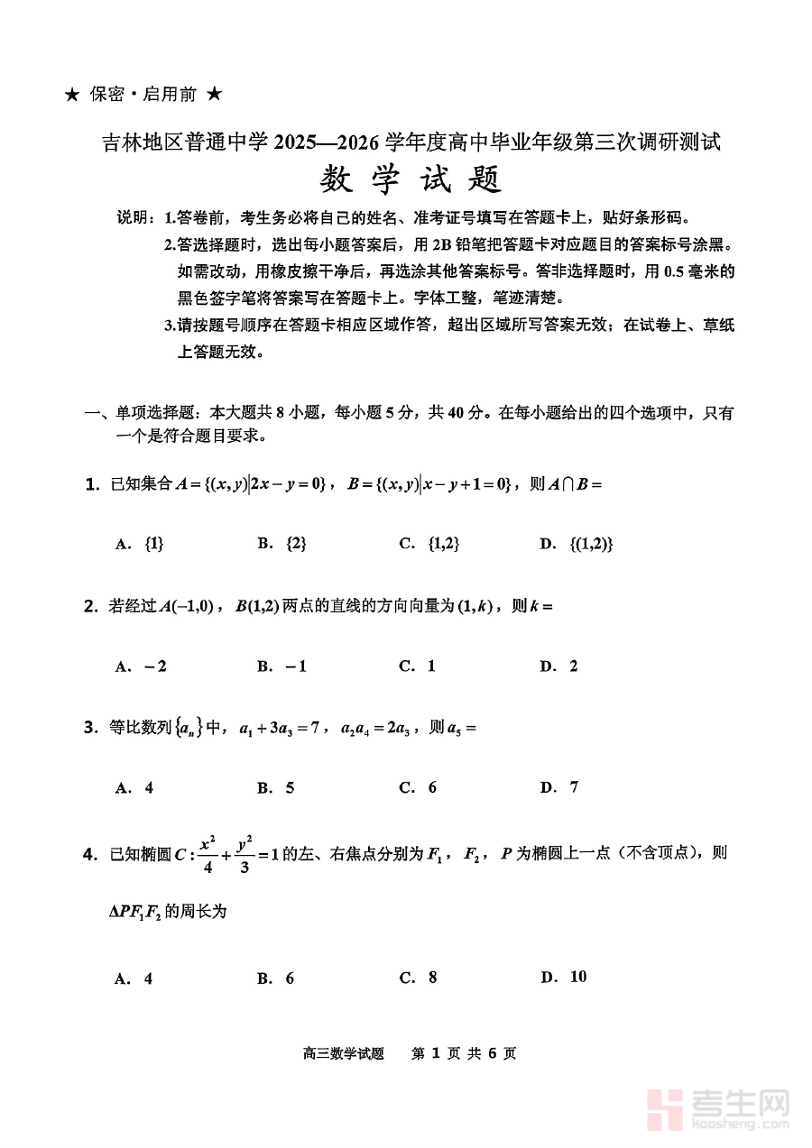 《数学-2026届吉林地区2025-2026高三下第三次调研测试(吉林三调)》是针对2026届吉林地区高三学生在2025-2026学年下学期开展的第三次调研测试相关的数学学科备考资料,该考试属于区域内高三阶段重要的调研类测试,旨在通过标准化的测试形式反映学生当前的数学学习状况与区域整体学情水平,为后续的复习与教学调整提供基础依据。