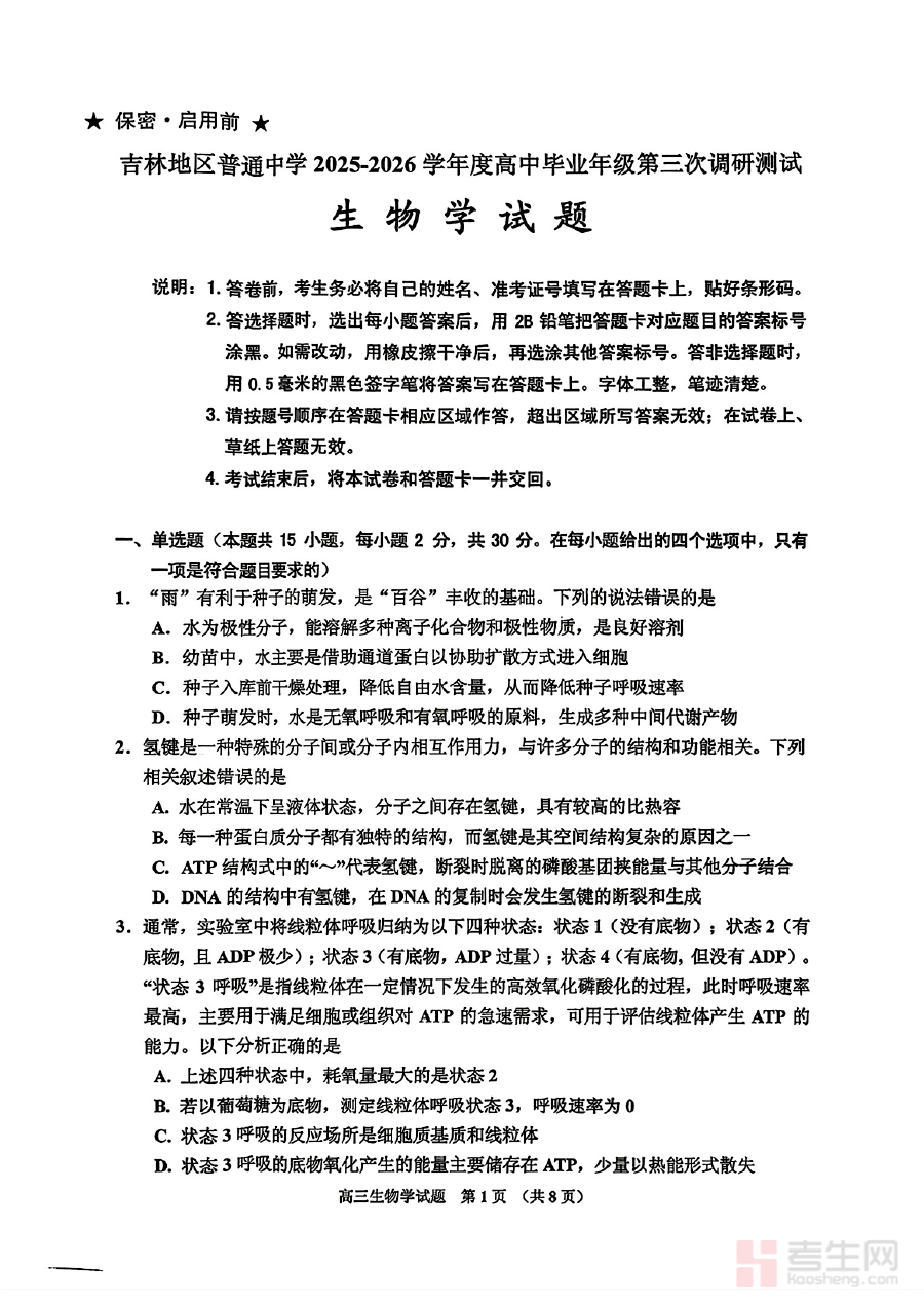 其适用人群主要为2026届吉林地区的高三学生及生物教师。对于学生而言,它是阶段检测的重要参考,能帮助熟悉本地调研测试的命题风格与考查重点;对于教师来说,可用于评估教学效果、优化备考计划,进一步增强复习指导的有效性,共同推动高三生物备考工作向更精准的方向推进,助力师生在第三次调研测试中取得理想结果。