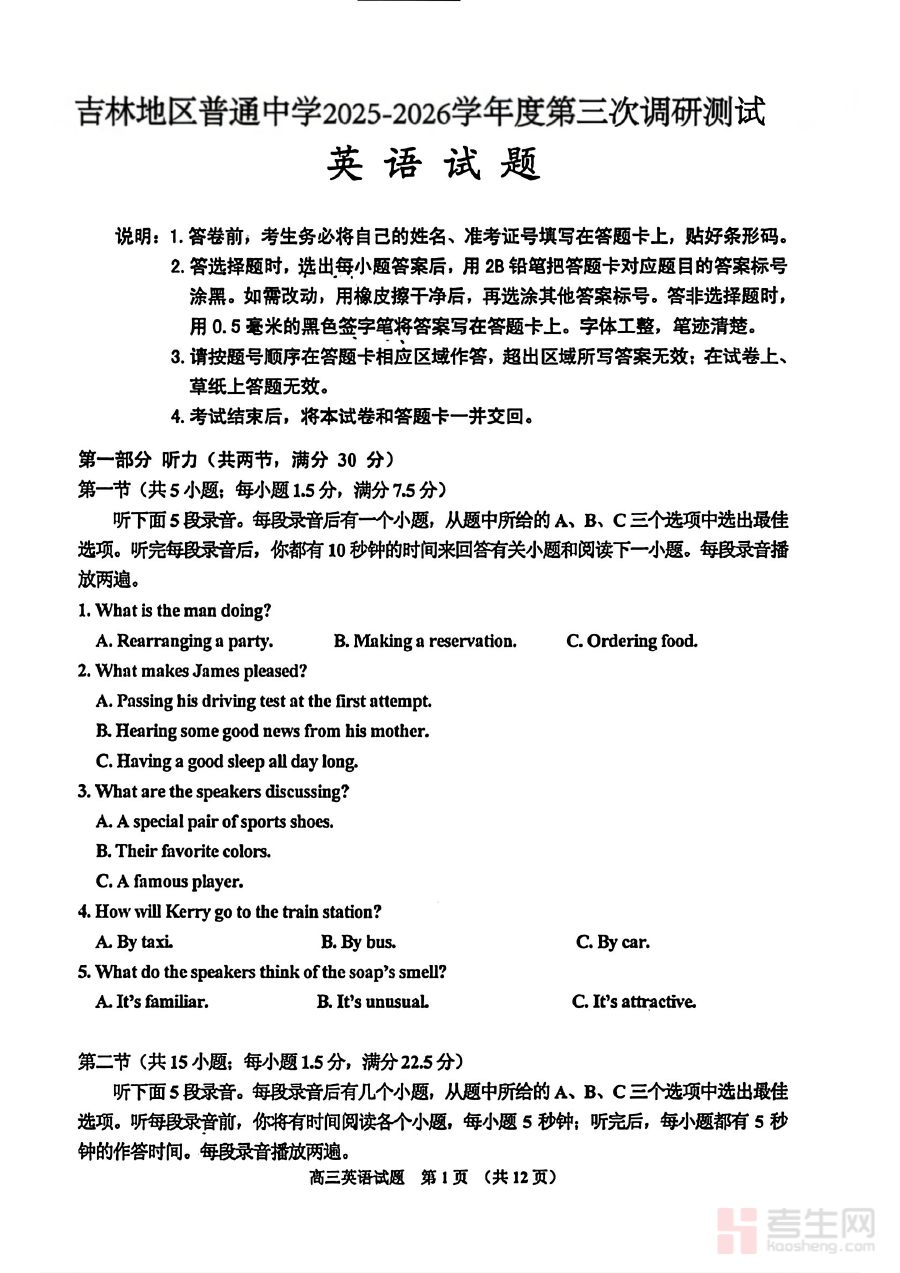 《英语-2026届吉林地区2025-2026高三下第三次调研测试(吉林三调)》是面向2026届吉林地区高三学生、适配2025-2026学年下学期第三次调研测试的英语学科备考资料,紧密结合该区域高三英语教学进度与阶段性评估要求,体现吉林地区高考英语备考的区域特色。