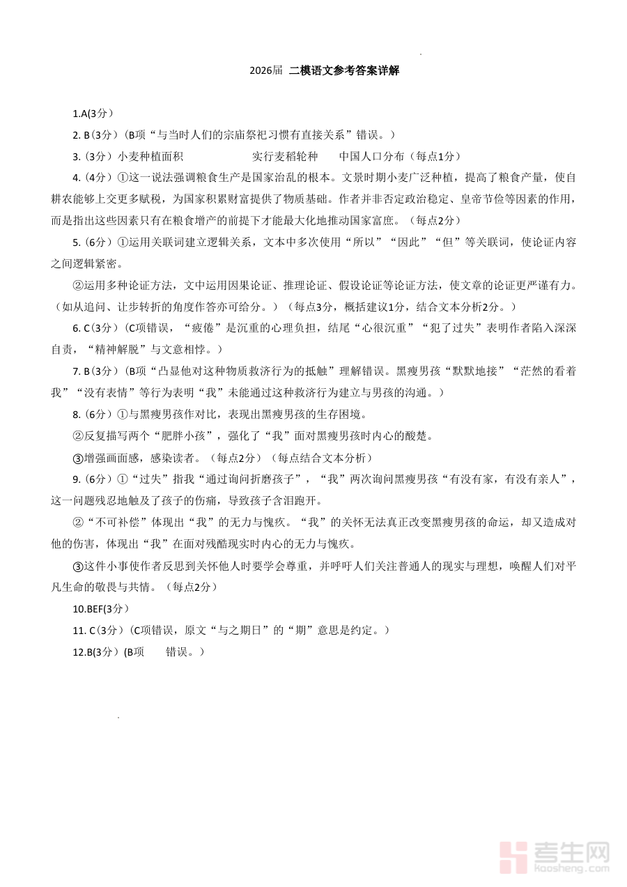 《长春市2026届高三语文第二次质量监测参考答案》是针对长春市2026届高三学生语文科目第二次质量监测考试的配套参考资料,依托该地区高三阶段语文教学进度与质量检测标准编制,为使用者提供本次考试的标准化答题指引。作为区域性高三语文阶段评估的官方参考依据之一,这份资料紧密衔接当地高三语文教学与阶段性检测需求,帮助相关人员快速获取考试的正确答题方向,是该阶段语文教学与备考工作的重要辅助资源。