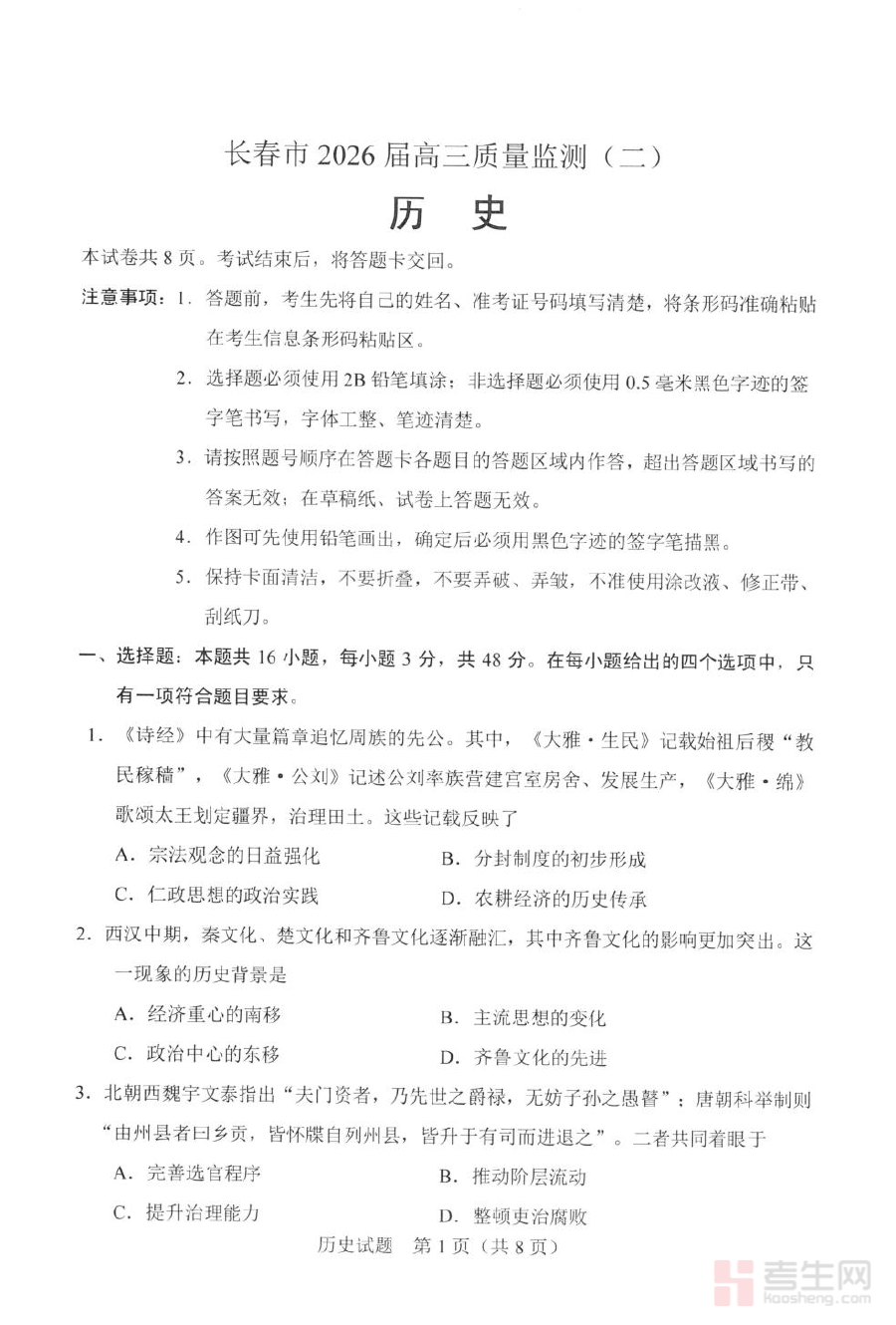 《2026届吉林长春市高三下学期质量监测(二)历史试卷及答案 2026届吉林长春市高三下学期质量监测(二)历史试卷》是针对2026届吉林长春市高三学生历史学科的阶段性备考资料,包含该次质量监测的完整试卷及配套答案两部分内容,对应高三下学期中期的重要阶段检测考试,能够为考生提供贴合本地教育评价标准的练习素材与参考答案依据,助力考生熟悉本地考试的命题方向与考查要求。