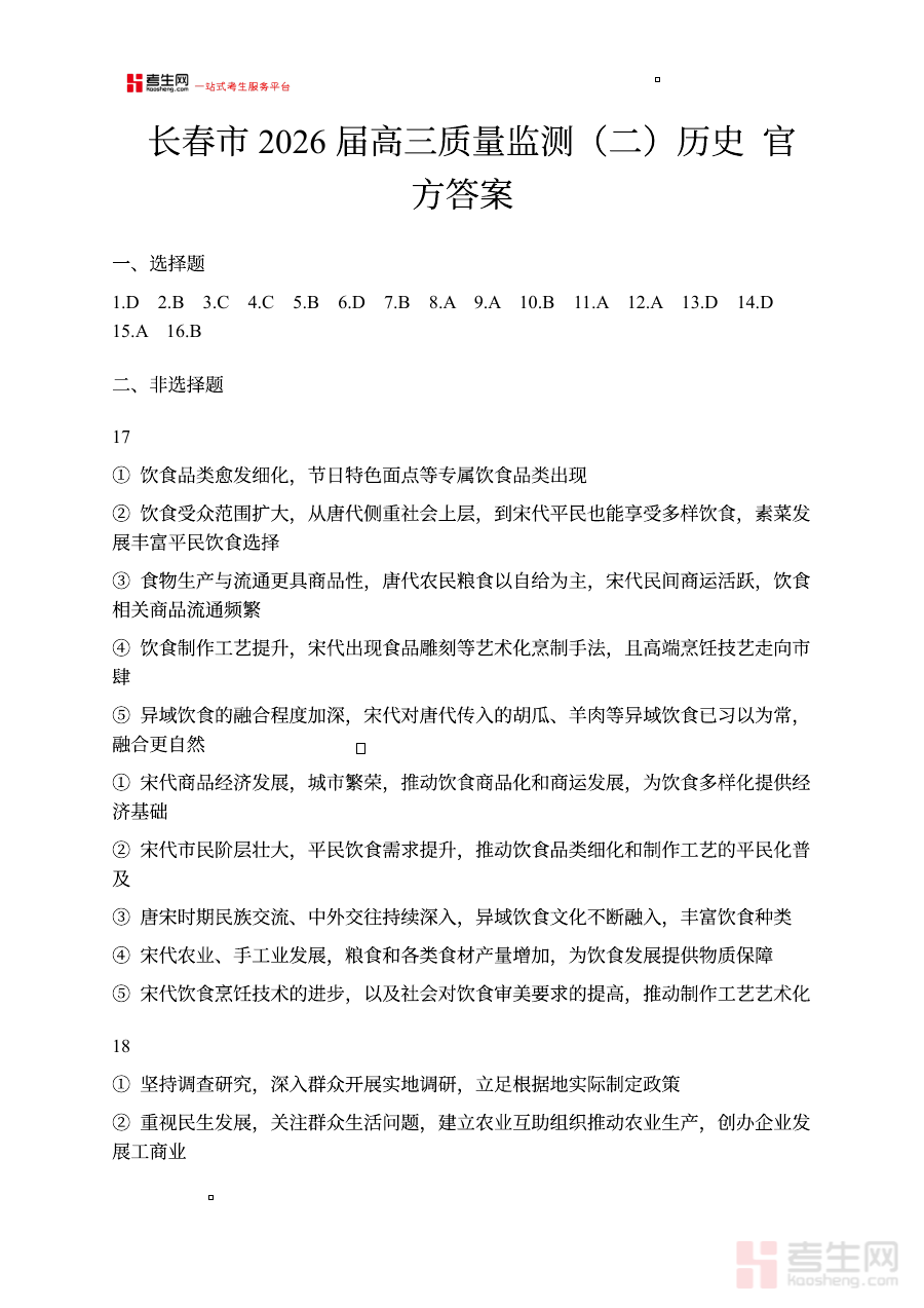 《2026届吉林长春市高三下学期质量监测(二)历史试卷及答案 长春市2026届高三质量监测(二)历史官方答案》是针对2026届吉林省长春市高三学生的阶段性考试配套资料,包含该地区高三下学期质量监测(二)的历史试卷及官方权威答案,为高三历史学科的阶段备考提供精准的本地考试参考依据。