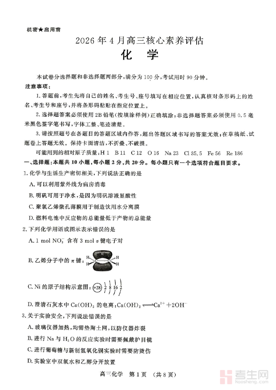 《山东省2026年4月高三核心素养评估检测 化学试题》是2026年4月山东省针对高三学生开展的核心素养评估检测中的化学学科试题资料。该资料紧密贴合山东省高三化学教学进度与核心素养培养要求,是反映该地区高三化学教学质量与学生素养发展水平的重要阶段性载体。