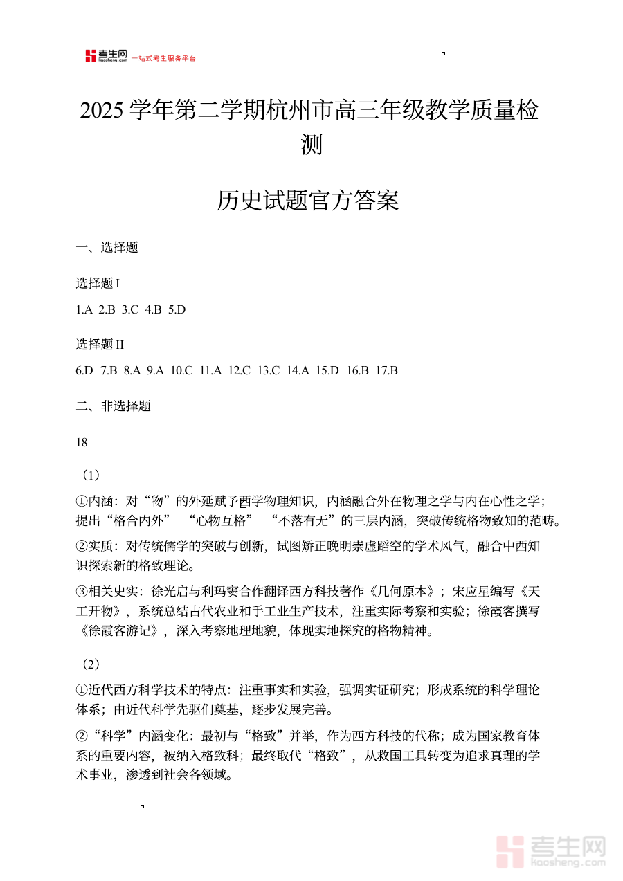 《2026届浙江杭州市高三下学期教学质量检测(二模)历史试题及答案 2025学年第二学期杭州市高三年级教学质量检测历史试题官方答案》是针对2026届浙江省杭州市高三学生的下学期教学质量检测(二模)历史学科官方试题及答案资料,属于高三阶段重要的模拟考试备考资源,能够反映该地区高三历史学科的阶段性考查方向与要求。