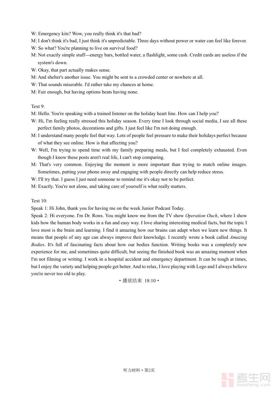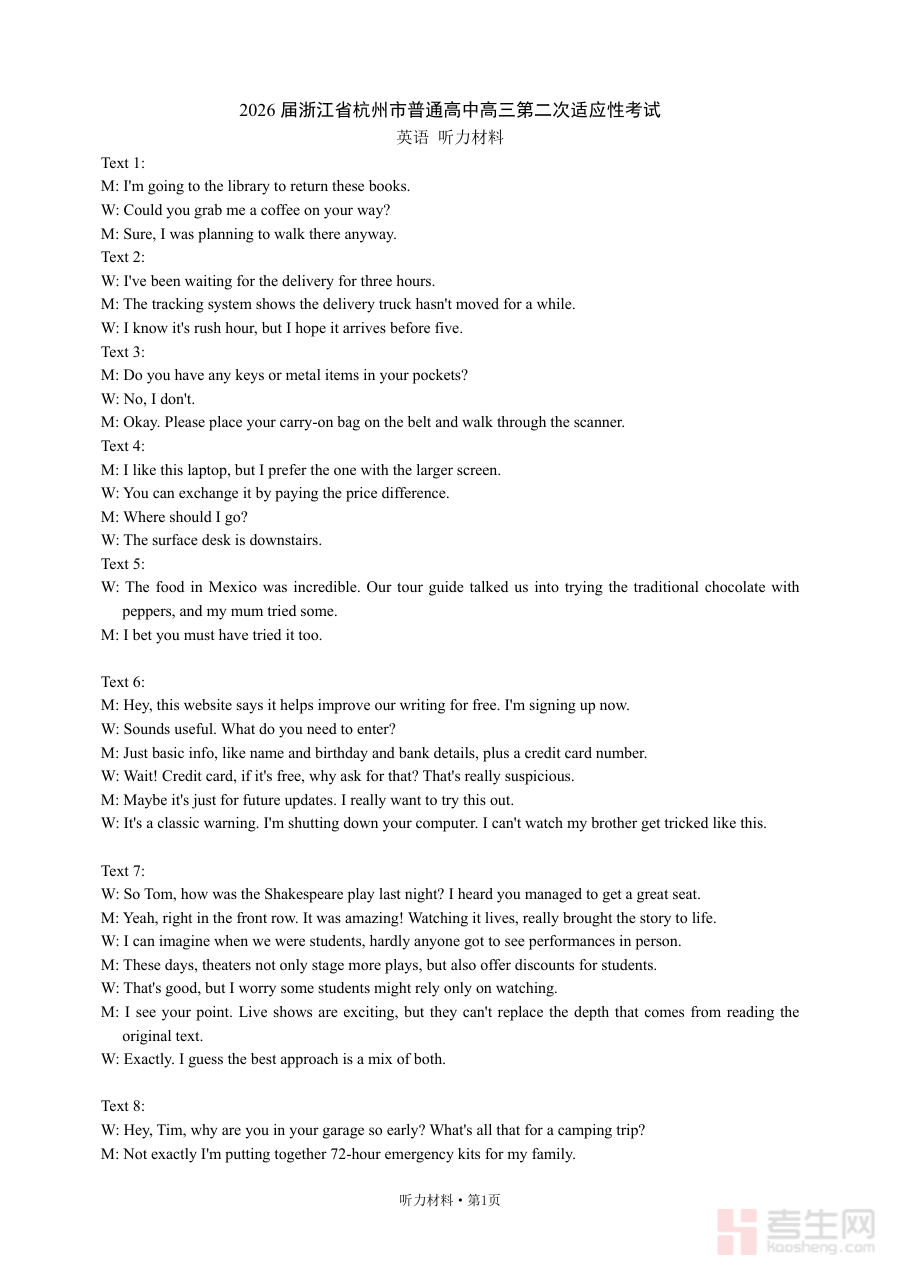 《【听力材料】2026届浙江省杭州市普通高中高三第二次适应性考试》是针对2026届浙江省杭州市普通高中高三学生设计的阶段性备考资料。该资料对应高三第二次适应性考试的听力部分,适应性考试作为高考前重要的模拟测试环节,旨在帮助学生熟悉高考相关考查模式与节奏,为后续的复习调整提供参考依据,是高三备考过程中不可或缺的阶段性资源。