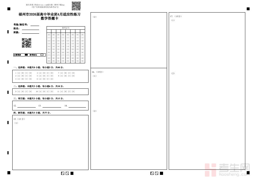 该答题卡的核心用途在于辅助考生进行全真模拟作答练习,助力教师或考生个人开展学情诊断与作答习惯培养工作。通过使用它进行模拟考试,使用者可提前适应省质检福州卷数学考试的作答形式与节奏,有效规避因答题卡使用不规范造成的不必要失分,同时为后续精准制定备考规划提供实践参考依据。