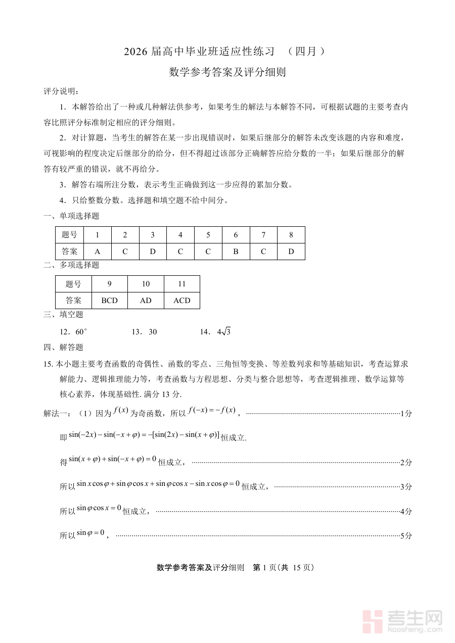 《福州市2026届高中毕业班4月适应性练习 数学答案》是福州市针对2026届高中毕业生开展的4月适应性练习的数学科目配套参考答案资料,属于该地区高中阶段重要备考节点的辅助材料,与对应适应性练习形成完整的阶段性检测支持体系。