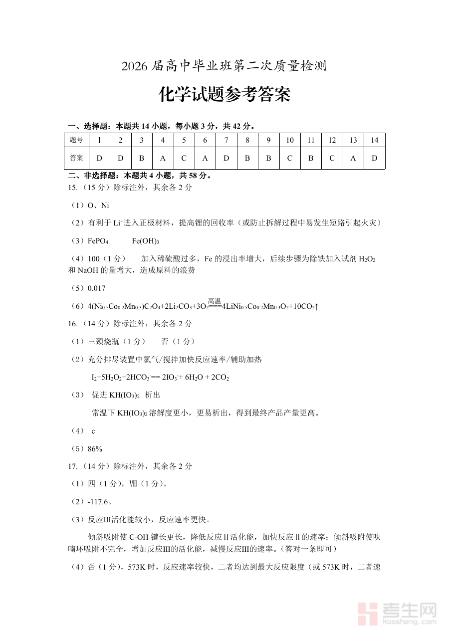 《安徽省铜陵、黄山、宣城(三市二模)2026届高三4月份质量检测(全)化学参考答案(定稿)》是针对2026届安徽省铜陵、黄山、宣城三市联合开展的高三4月份第二次模拟质量检测的化学学科官方定稿参考答案。该资料与三市二模化学考试紧密对应,为考生和教学者提供了权威的作答参考依据,是高三化学备考过程中与区域模拟考试配套的关键资料之一,能够有效衔接区域教学进度与高考备考需求。