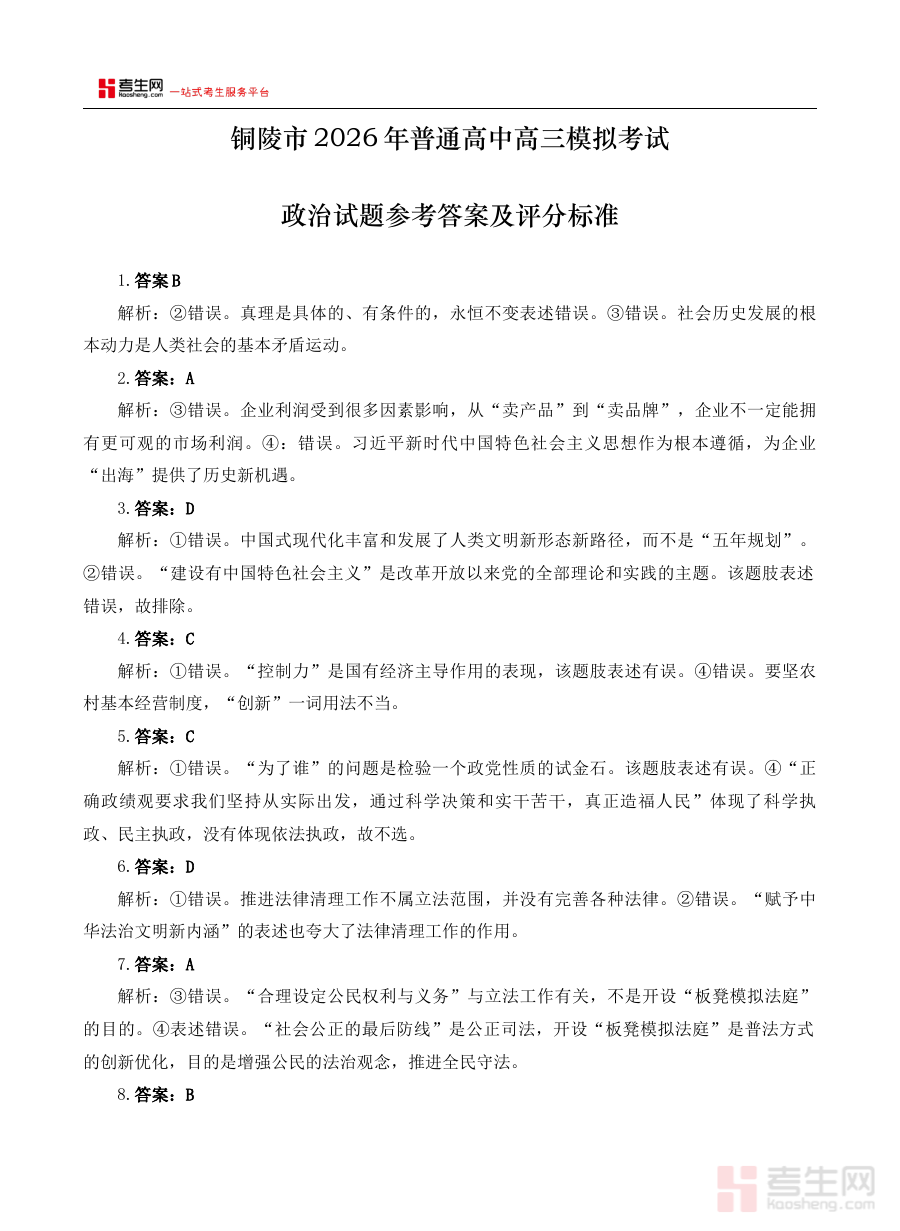 《安徽省铜陵、黄山、宣城(三市二模)2026届高三4月份质量检测(全)政治参考答案(定稿)》是针对2026届安徽省铜陵、黄山、宣城三市联合组织的高三4月份第二次模拟质量检测政治科目的官方定稿参考答案,属于高三阶段重要的备考辅助资料,与该次模拟考试的试题内容直接对应,为使用者提供权威的作答参考依据。