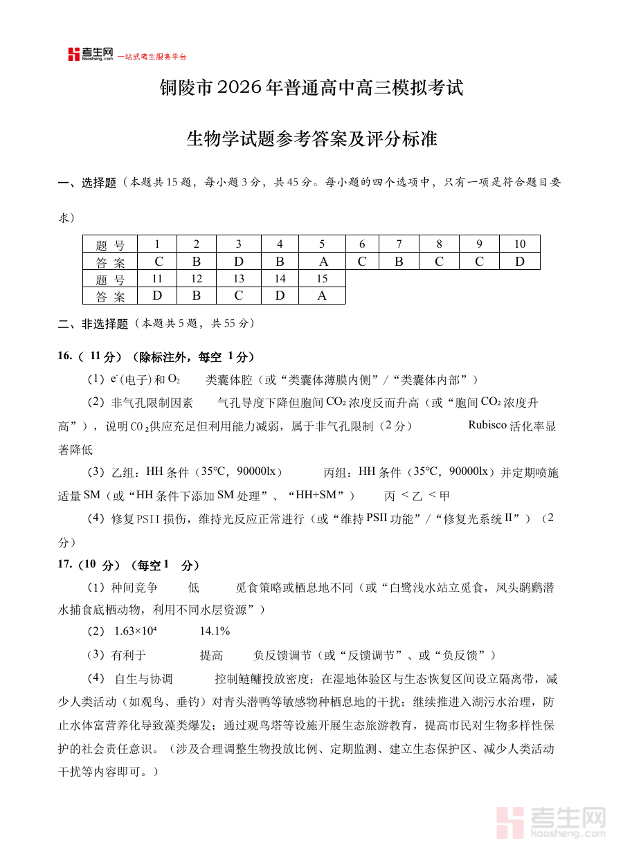 《安徽省铜陵、黄山、宣城(三市二模)2026届高三4月份质量检测(全)生物参考答案(定稿)》是针对安徽省铜陵、黄山、宣城三市联合组织的2026届高三4月份质量检测(二模)生物科目的官方定稿参考答案。作为该区域高三阶段重要的阶段性检测考试配套资料,它精准对应本次考试生物科目的内容与评分标准,不仅反映了命题方向与考查重点,还为师生提供了权威且准确的答题参照依据。