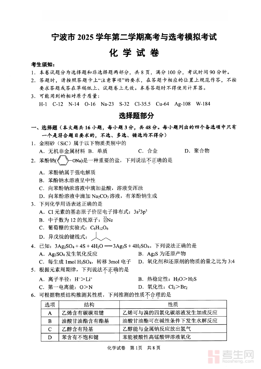 《宁波市2025学年第二学期高考模拟考试 化学》是宁波市教育系统在2025学年第二学期推出的针对高考化学科目的模拟考试资料,聚焦当地高三学生高考化学备考的阶段性需求,贴合高考化学的考查方向与命题趋势,为考生提供了与高考实际考试场景相近的模拟体验,是高三化学备考过程中具有区域参考价值的阶段性学习资料。