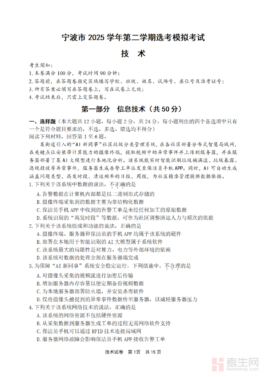 该资料主要适用于宁波市2025届高考技术科目考生,作为第二学期重要的阶段检测工具,助力考生查漏补缺、调整备考节奏。其核心价值在于通过模拟真实高考场景,让考生提前适应考试氛围与题型结构,增强应试能力,为高考的高效备考提供有力支持。
