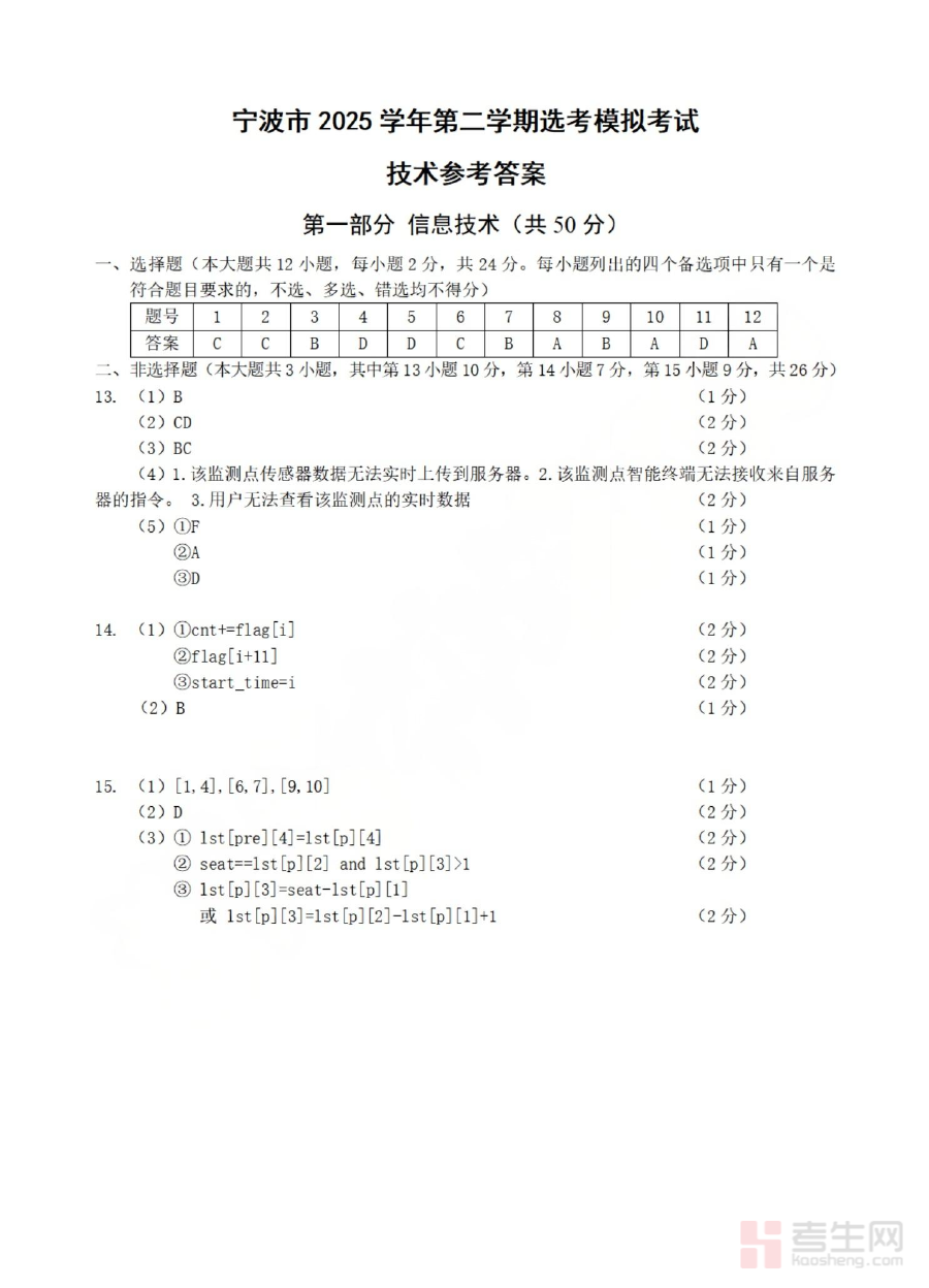 《宁波市2025学年第二学期高考模拟考试 技术答案》是宁波市教育系统在2025学年第二学期面向本地高中学生推出的高考模拟考试配套资料,对应同期举行的高考技术科目模拟考试。作为区域性高考备考体系的重要组成部分,该资料聚焦技术学科的模拟考试反馈需求,为相关主体提供标准化的作答参考依据,助力备考环节的有序推进。