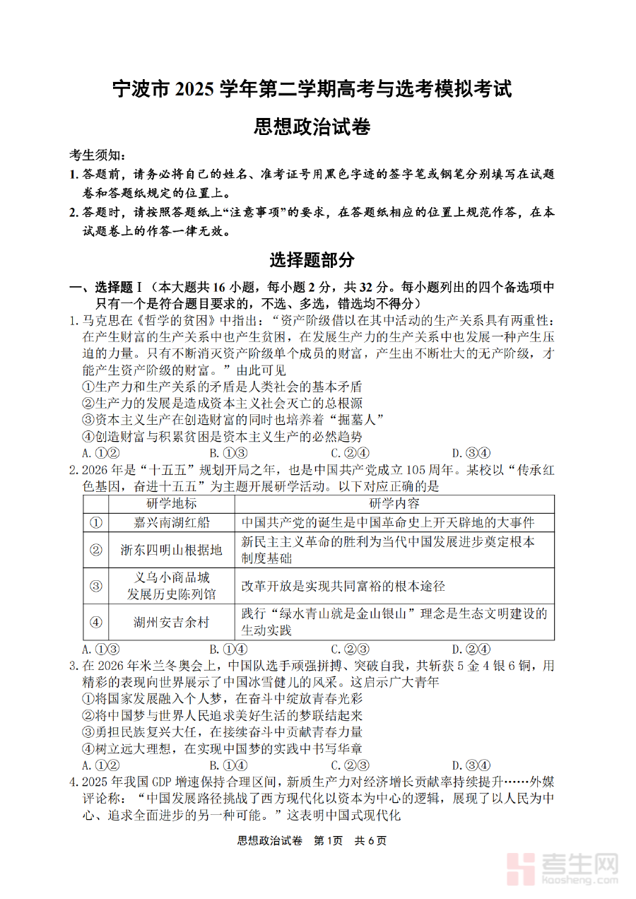 《宁波市2025学年第二学期高考模拟考试 政治》是针对宁波市2025学年第二学期组织的高考政治学科模拟考试相关备考资料,聚焦该地区高三学生高考前的阶段性复习需求,依托当地教育教学实际与高考命题趋势,为考生提供贴合本地考情的模拟训练载体,助力考生提前适应高考政治考试的整体要求与考查方向。