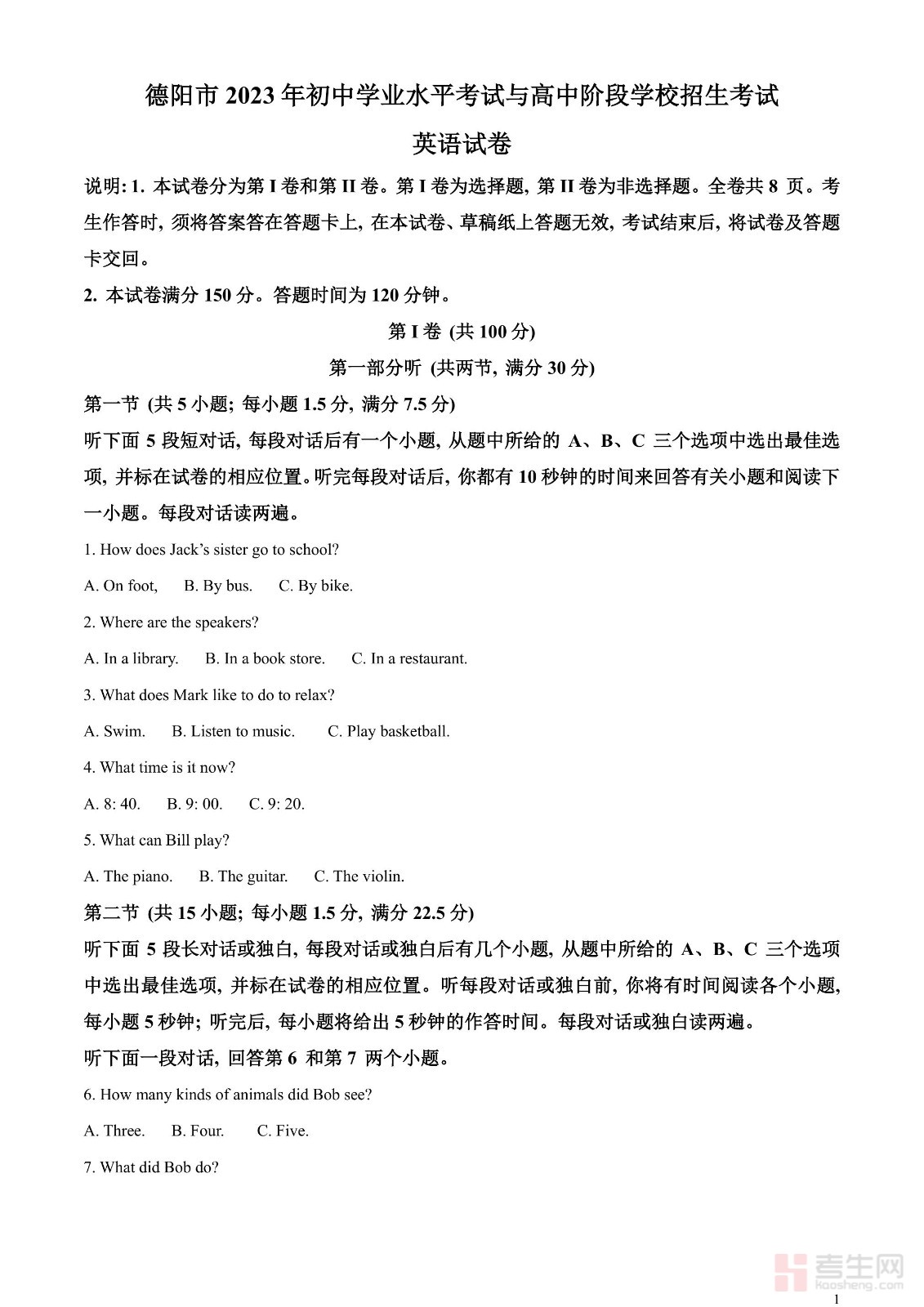 2023年四川省德阳市中考英语真题(解析版)