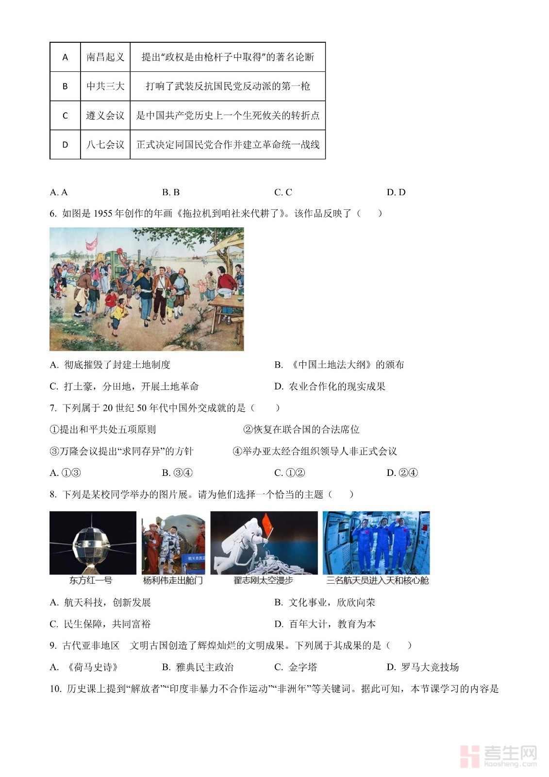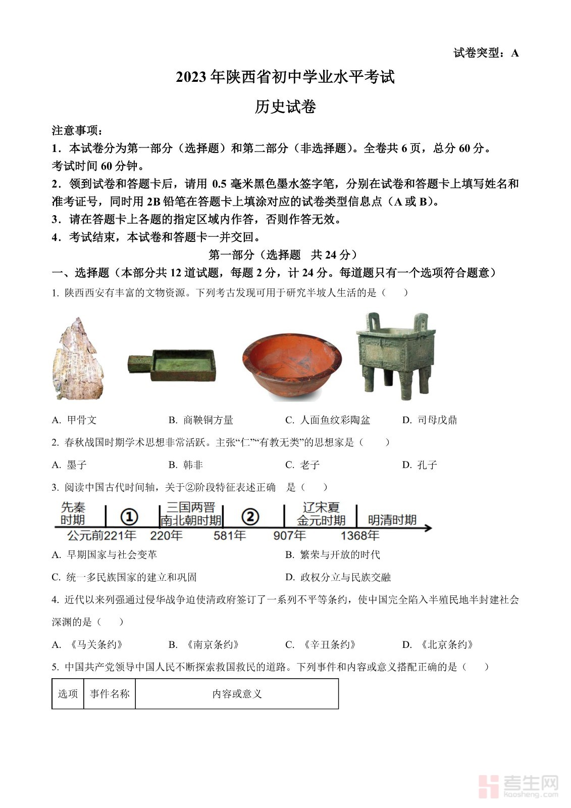 2023年陕西省中考历史真题(A卷)(原卷版)