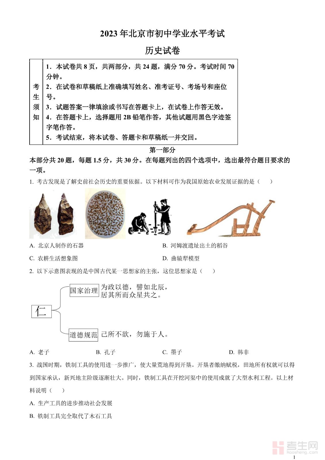 2023年北京市中考历史真题(原卷版)