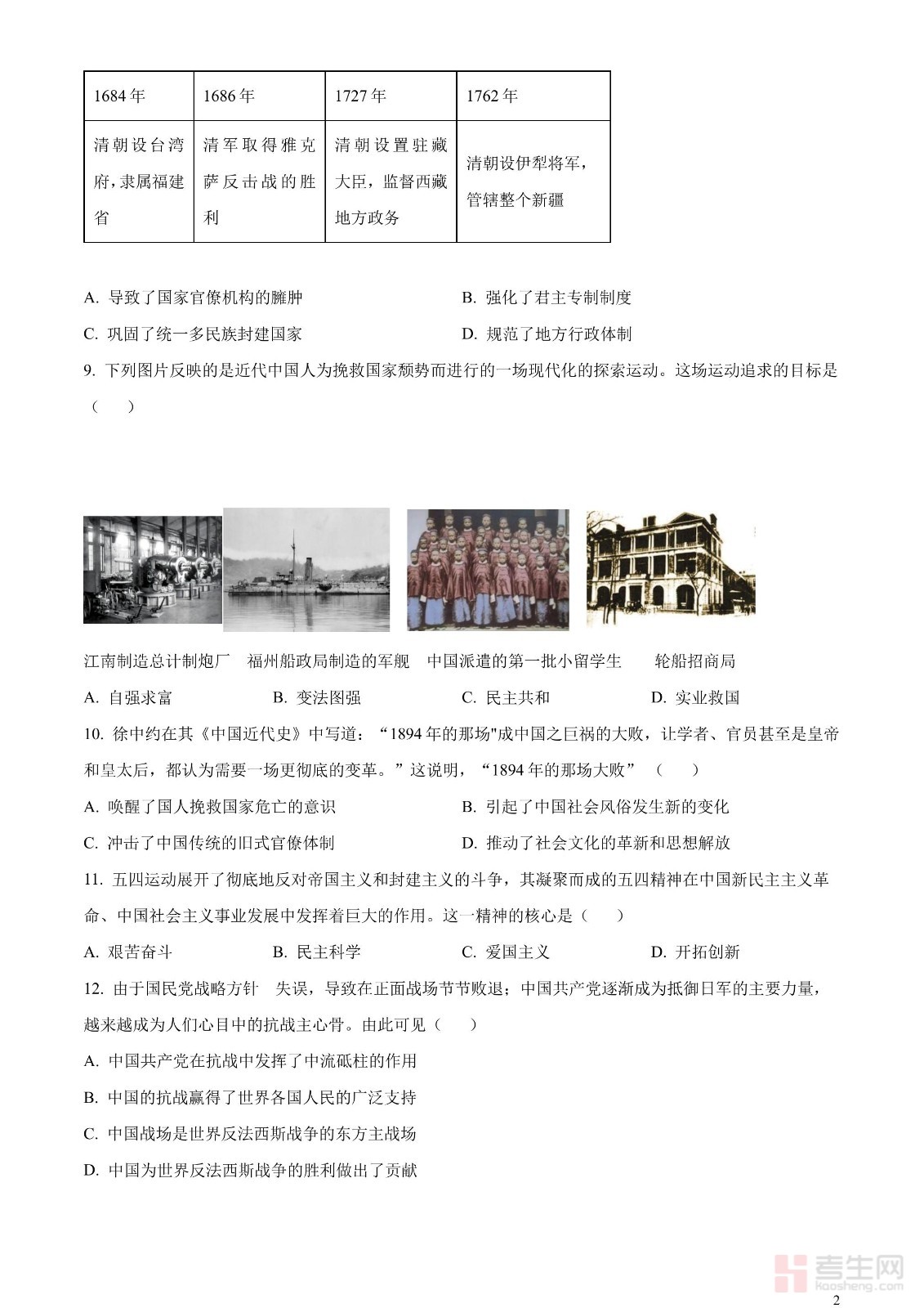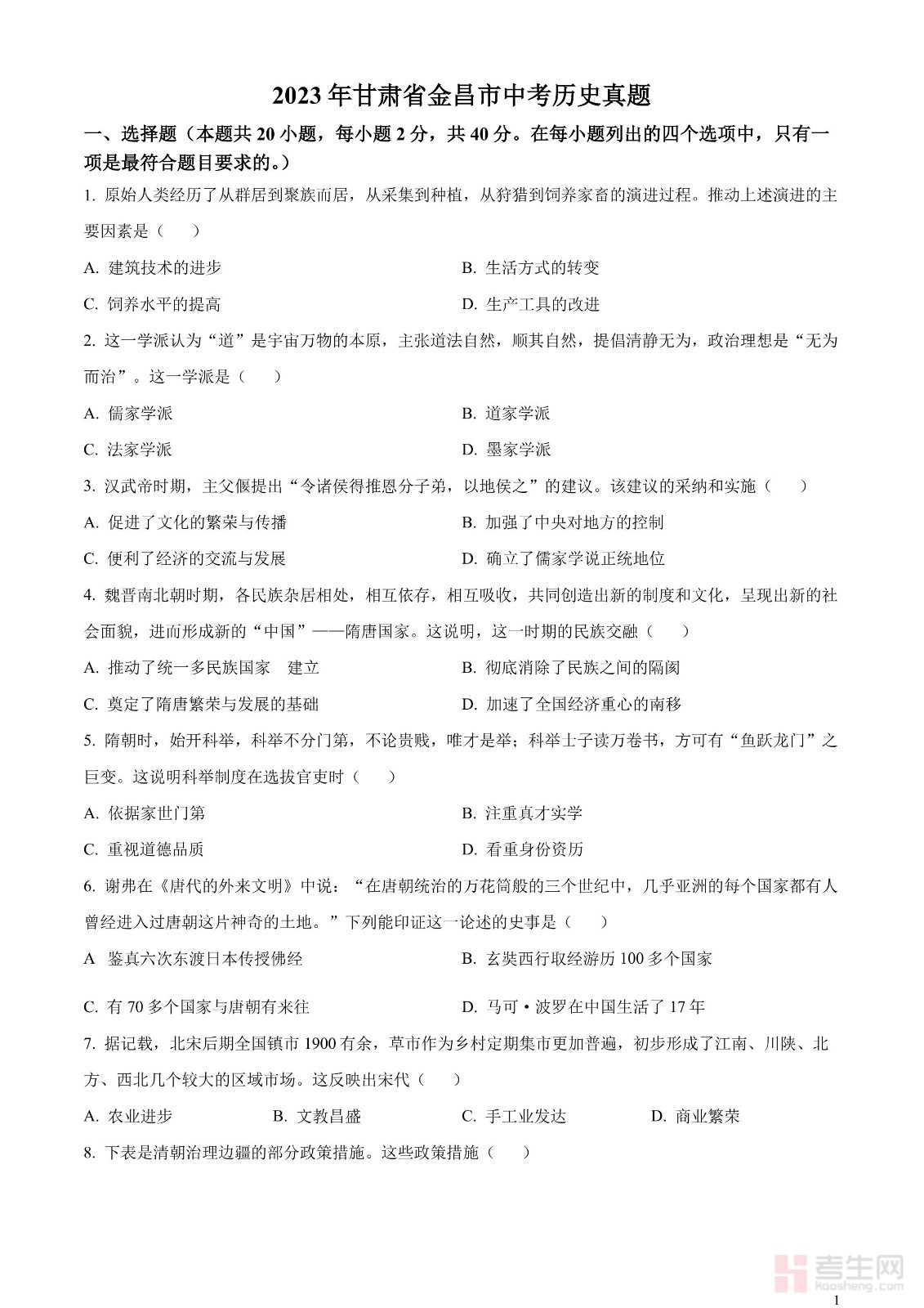 2023年甘肃省金昌市中考历史真题(原卷版)