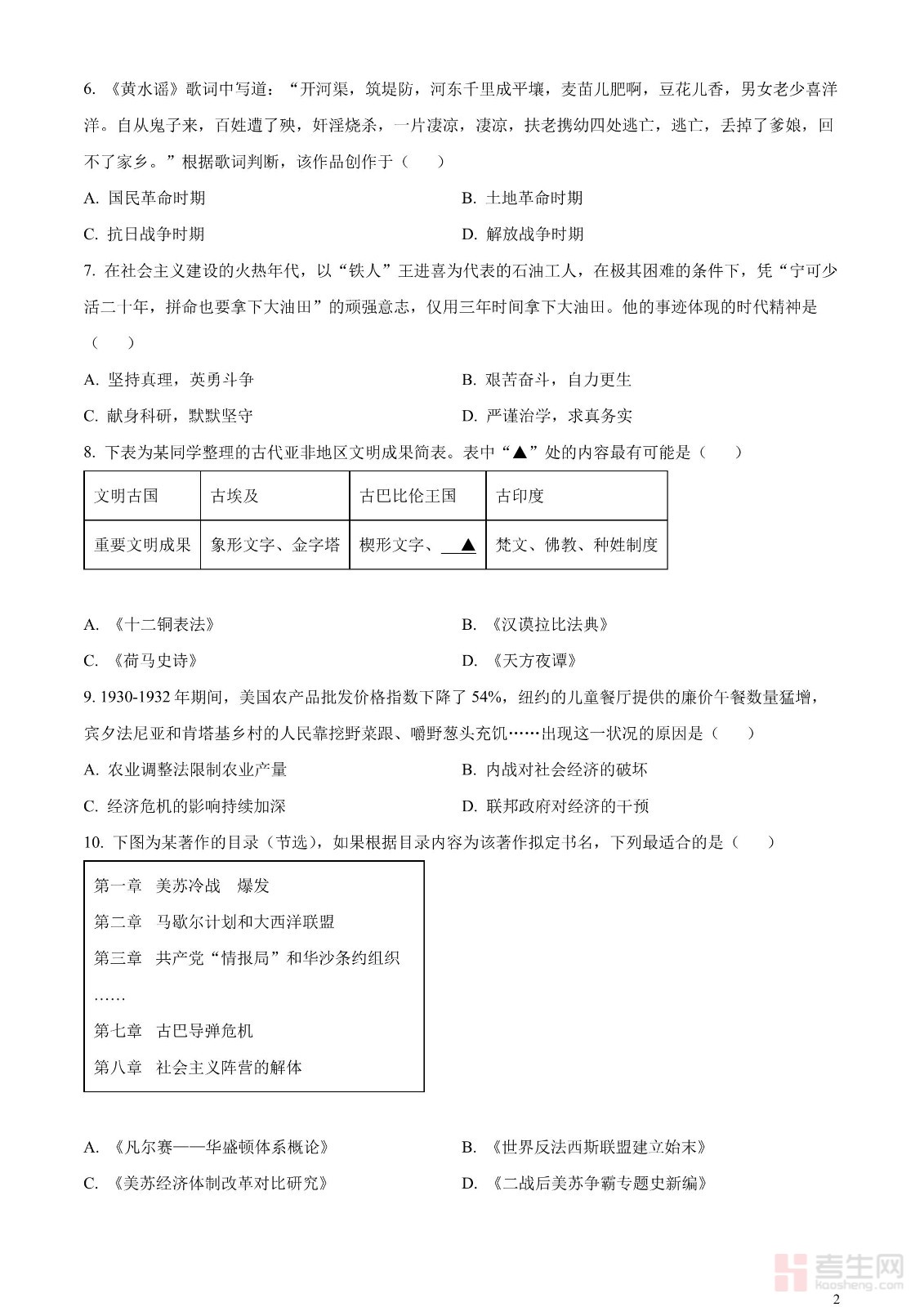2023年甘肃省平凉市中考历史真题(原卷版)