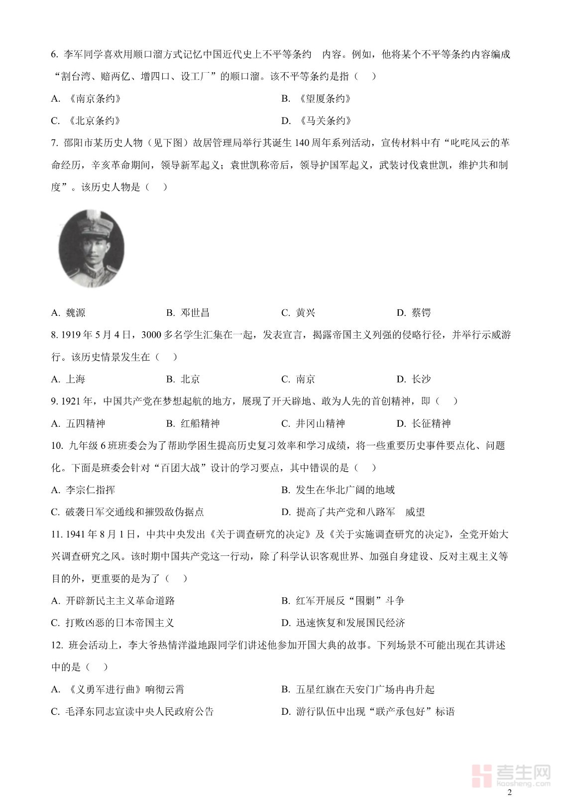 2023年湖南省邵阳市中考历史真题(原卷版)