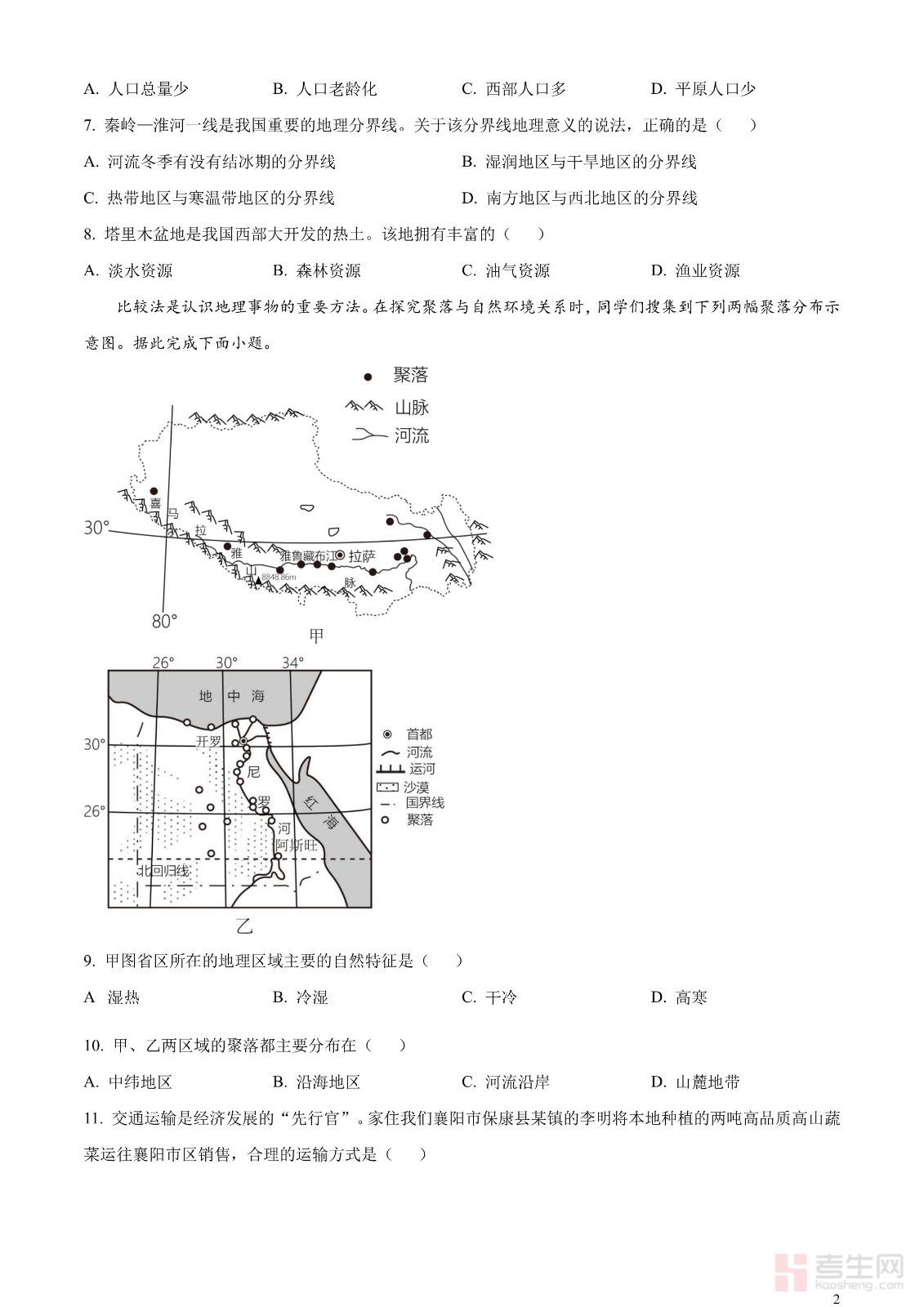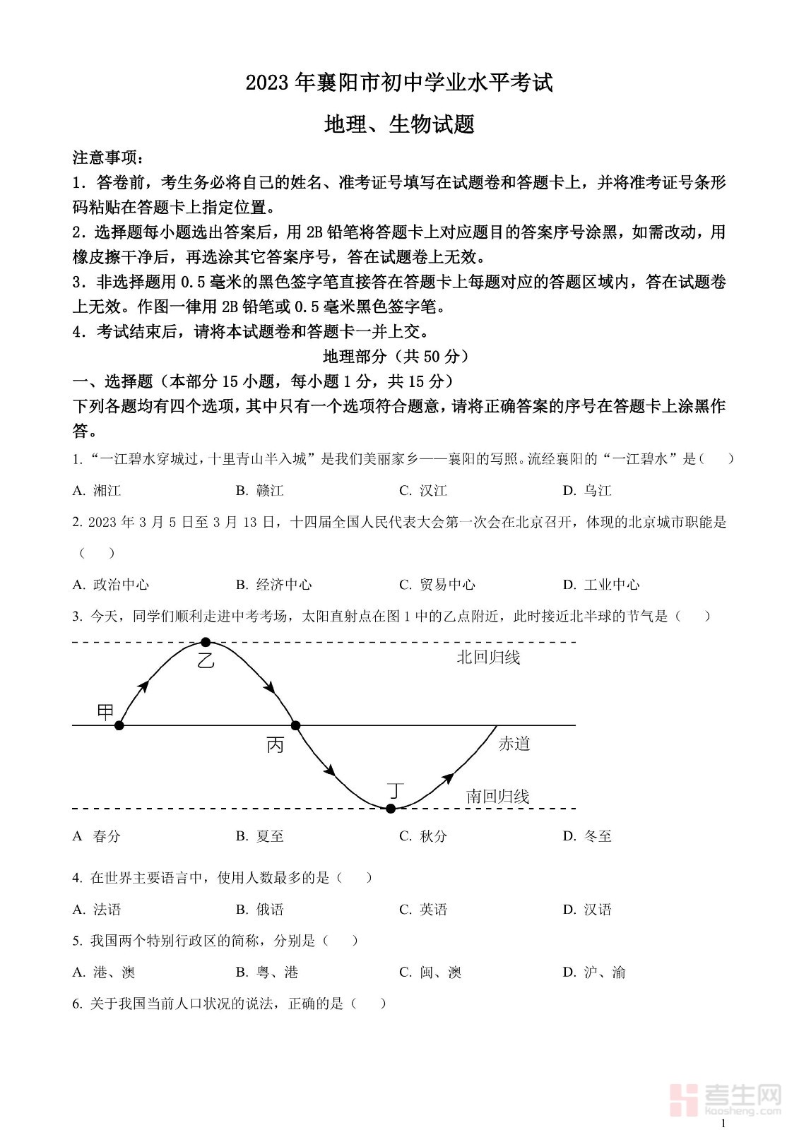 2023年湖北省襄阳市中考地理真题(原卷版)
