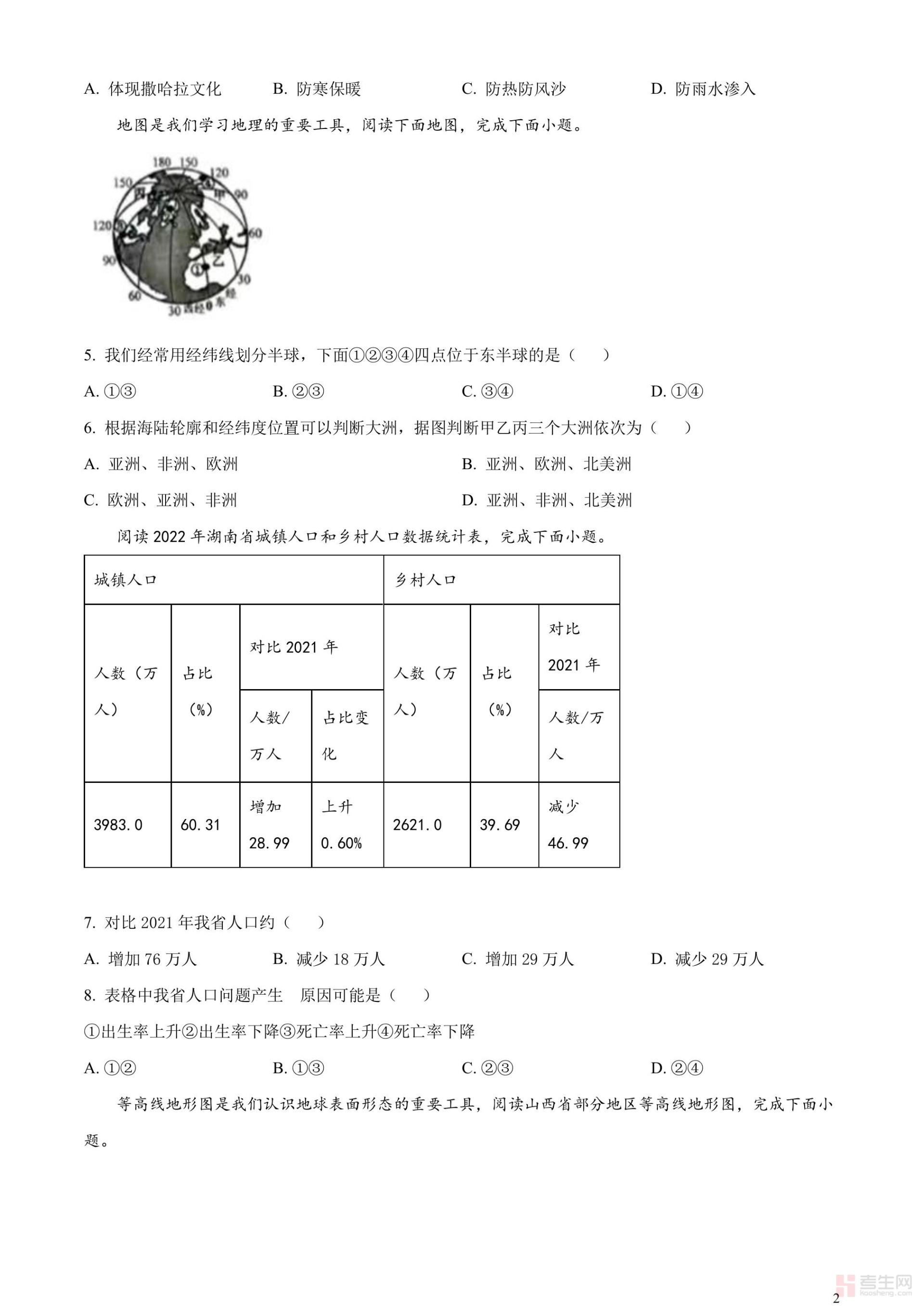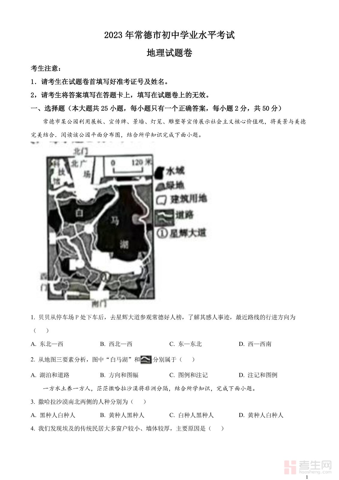 2023年湖南省常德市中考地理真题(原卷版)