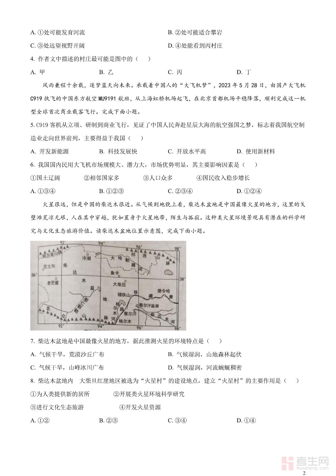 2023年湖南省娄底市中考地理真题 (原卷版)
