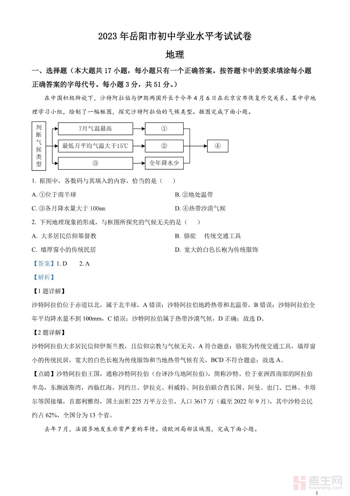 2023年湖南省岳阳市中考地理真题(解析版)