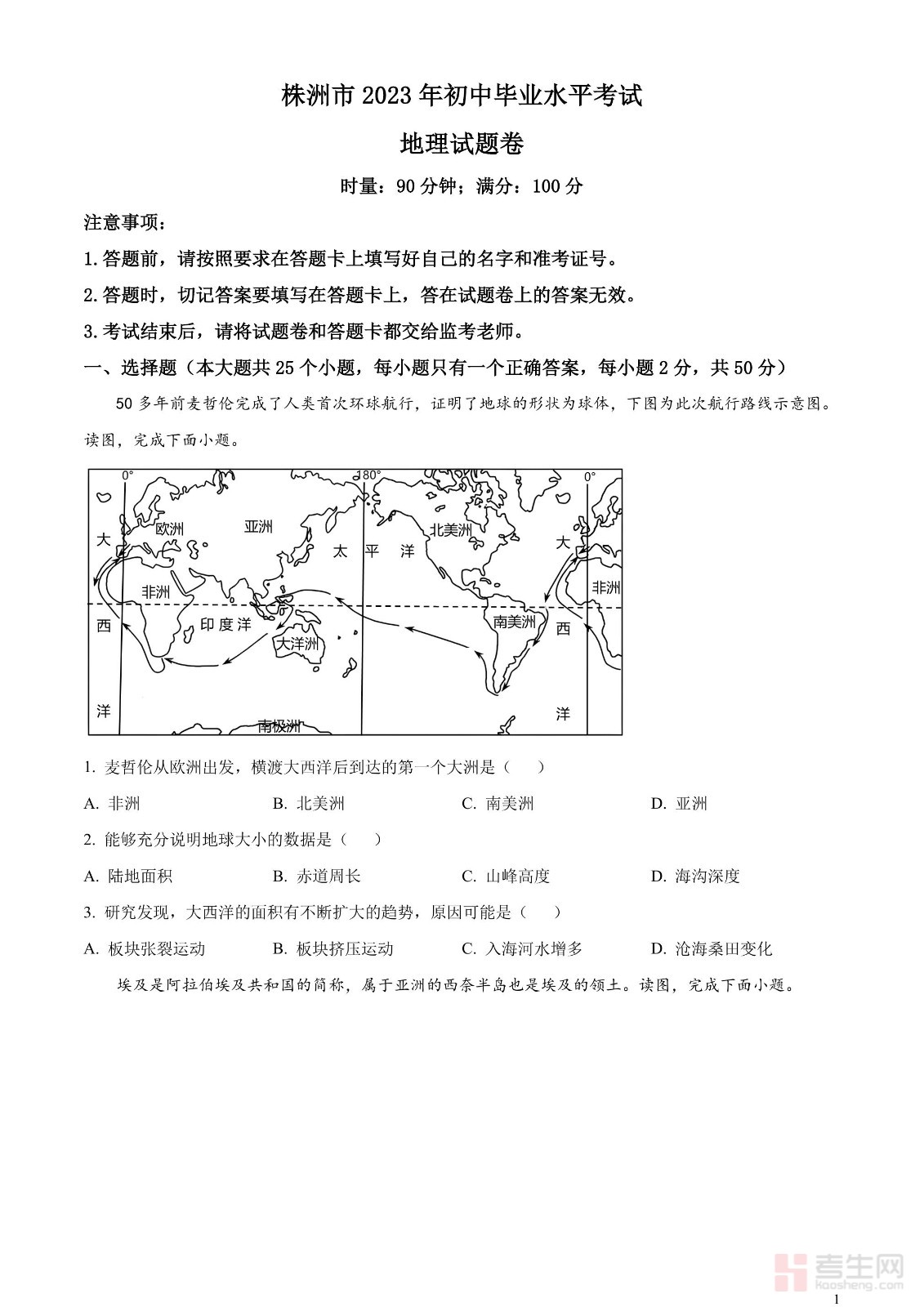 2023年湖南省株洲市中考地理真题(原卷版)