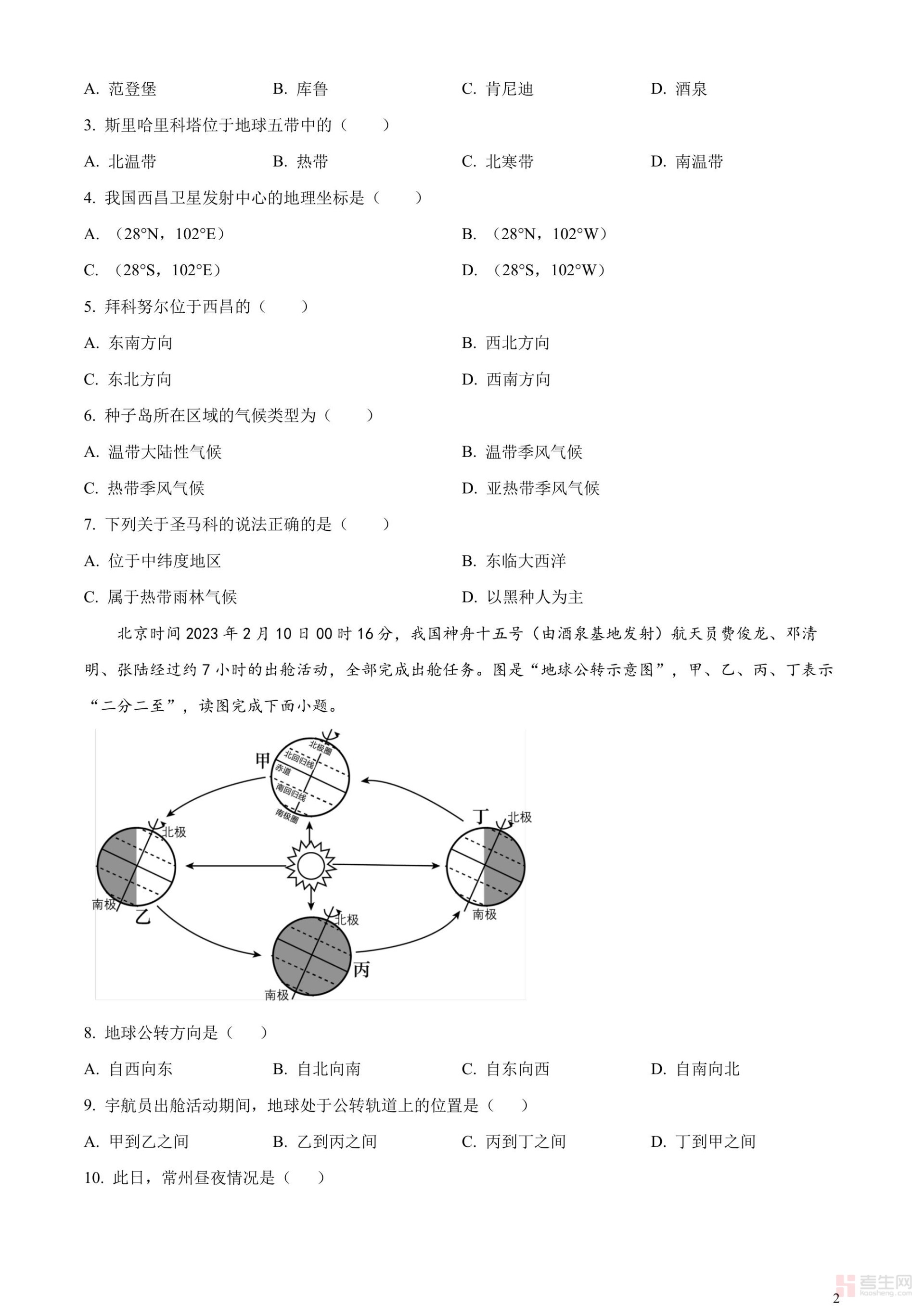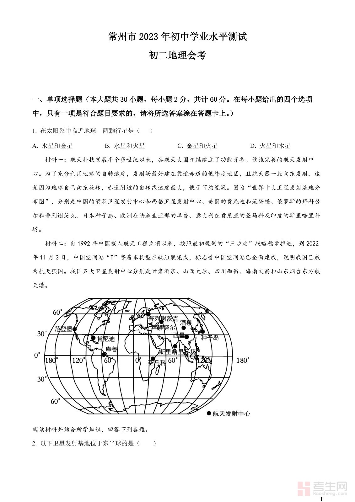 2023年江苏省常州市中考地理真题(原卷版)
