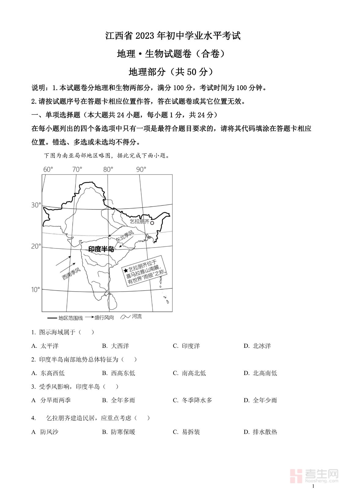 2023年江西省中考地理真题(原卷版)