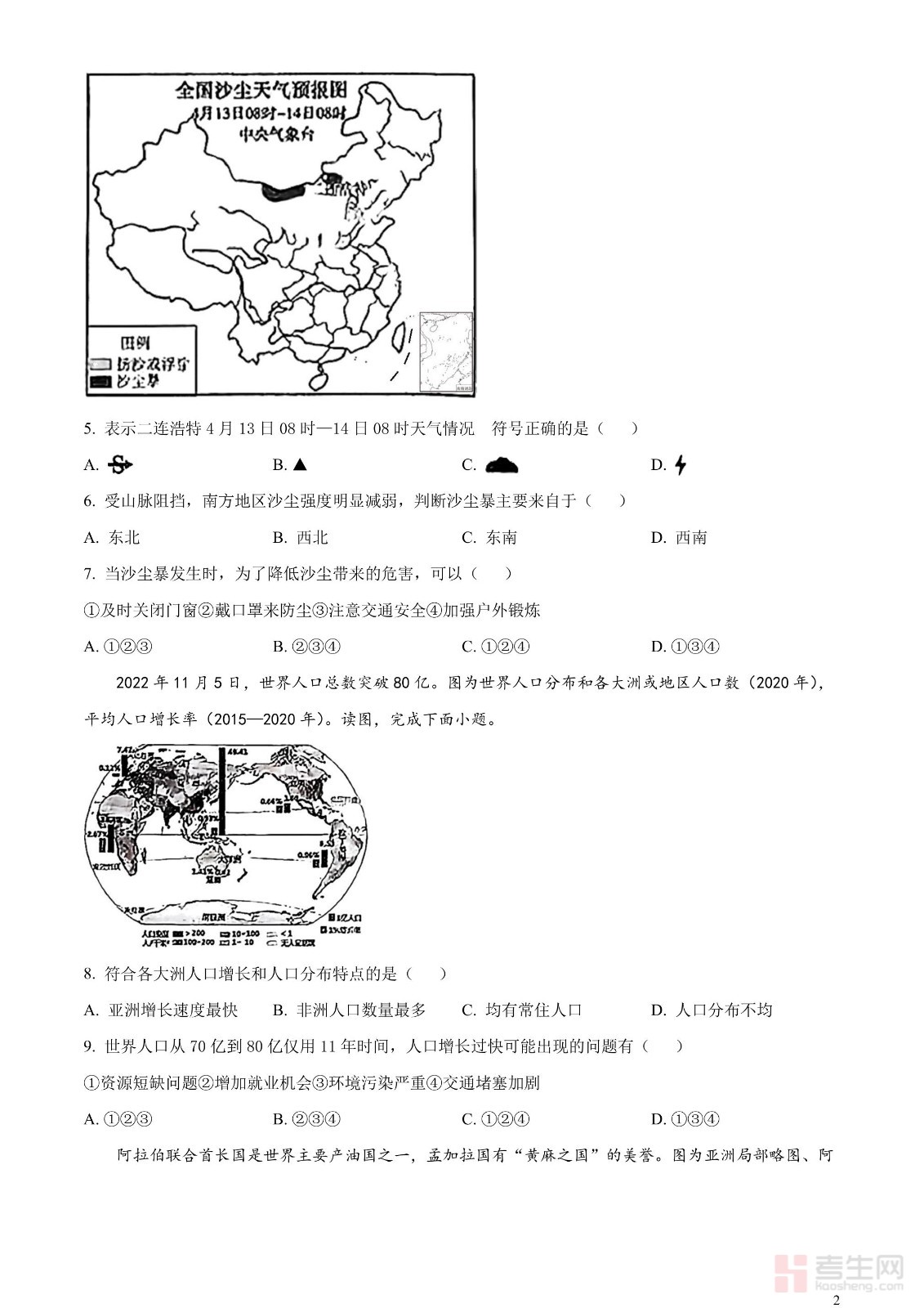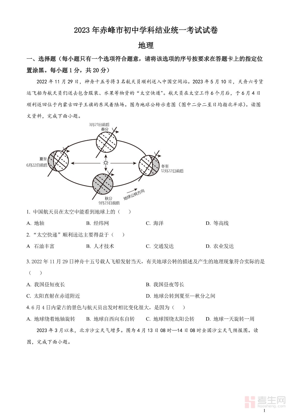 2023年内蒙古赤峰市中考地理真题(原卷版)