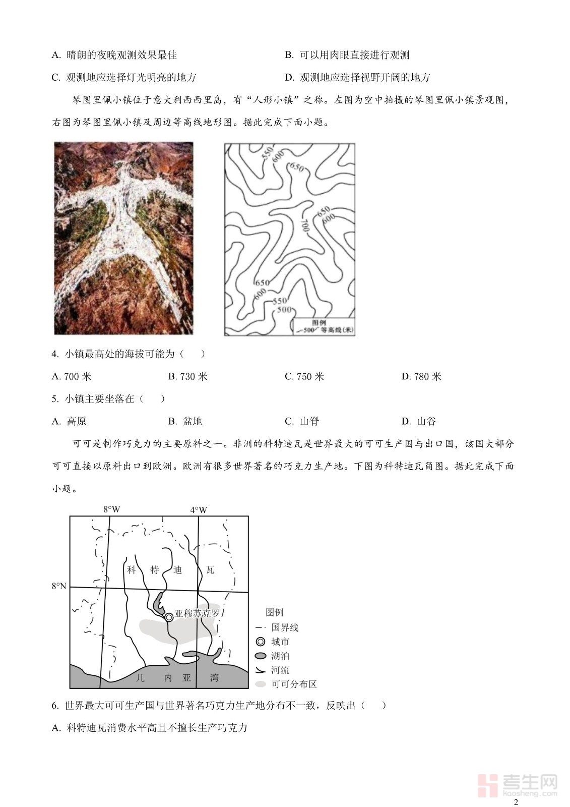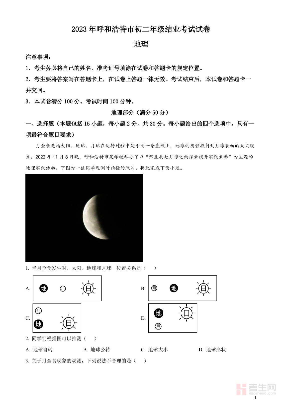 2023年内蒙古呼和浩特市中考地理真题(原卷版)