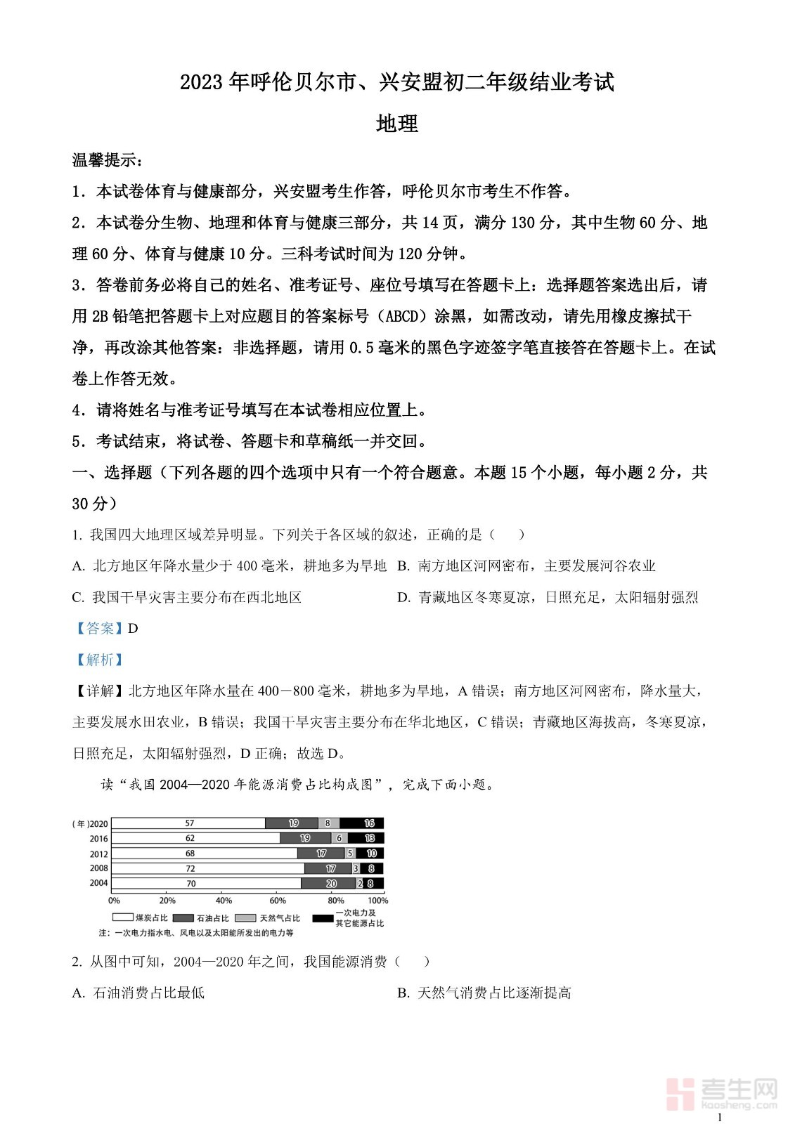 2023年内蒙古呼伦贝尔市、兴安盟中考地理试题(解析版)
