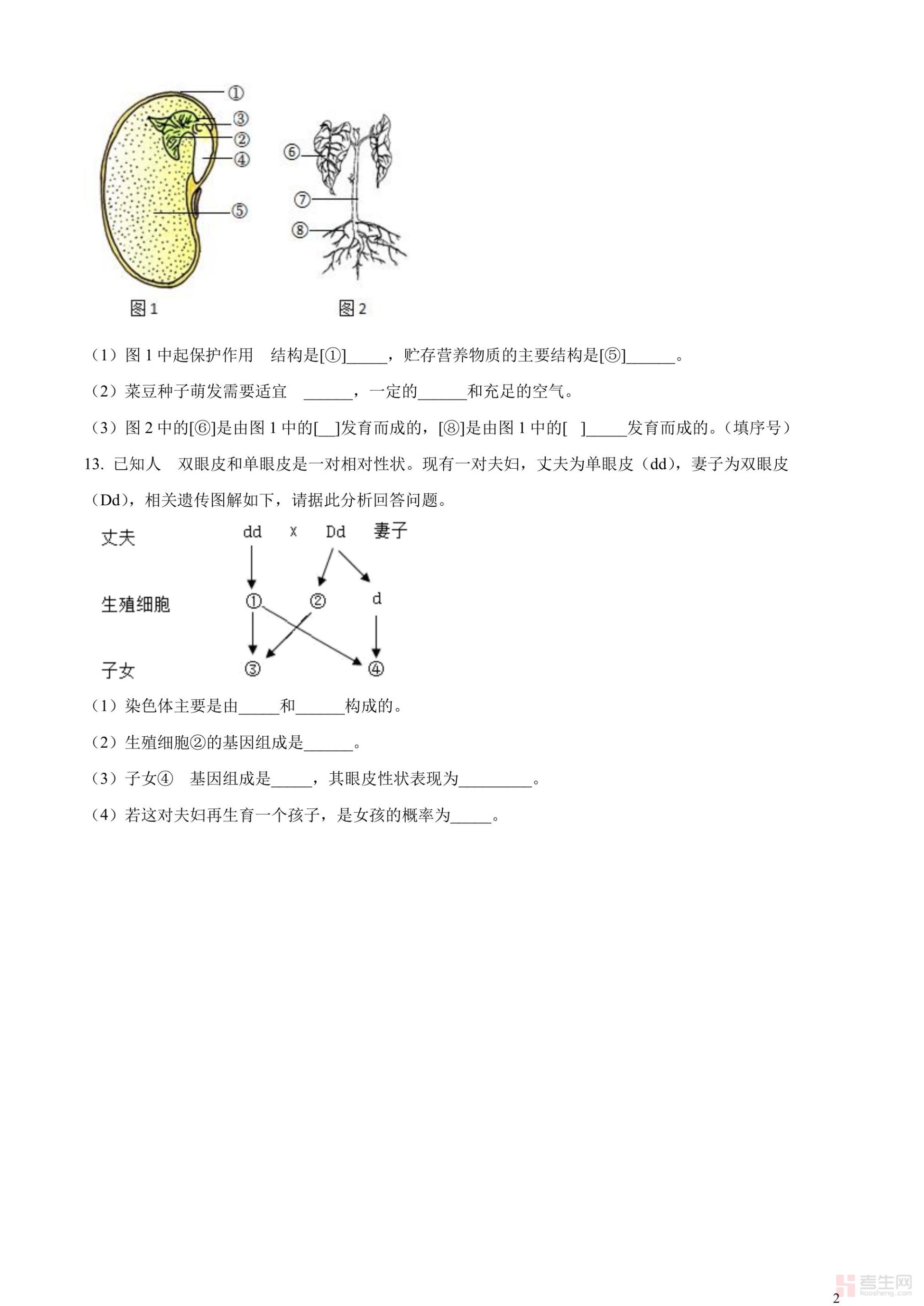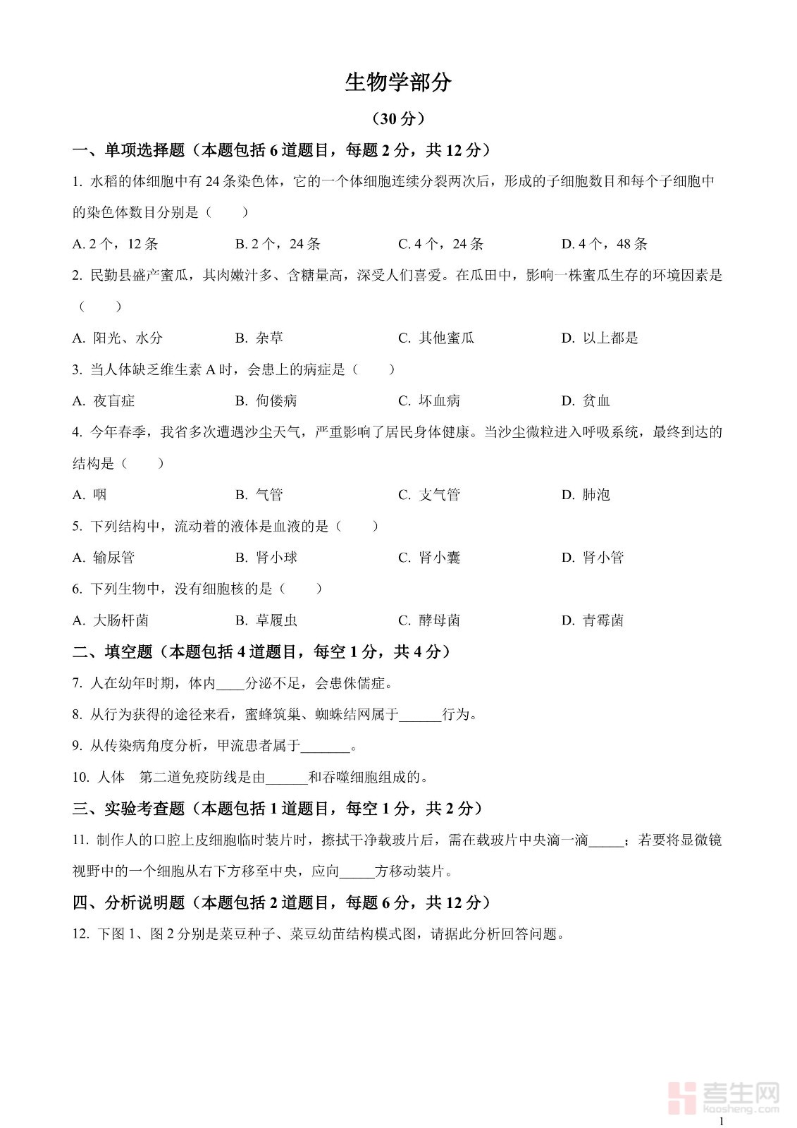 2023年甘肃省武威市、嘉峪关市、临夏州中考生物真题(原卷版)