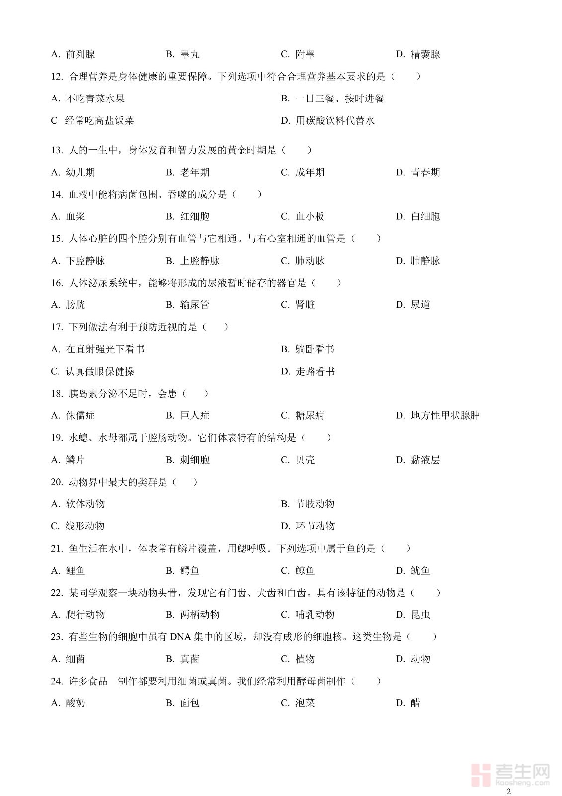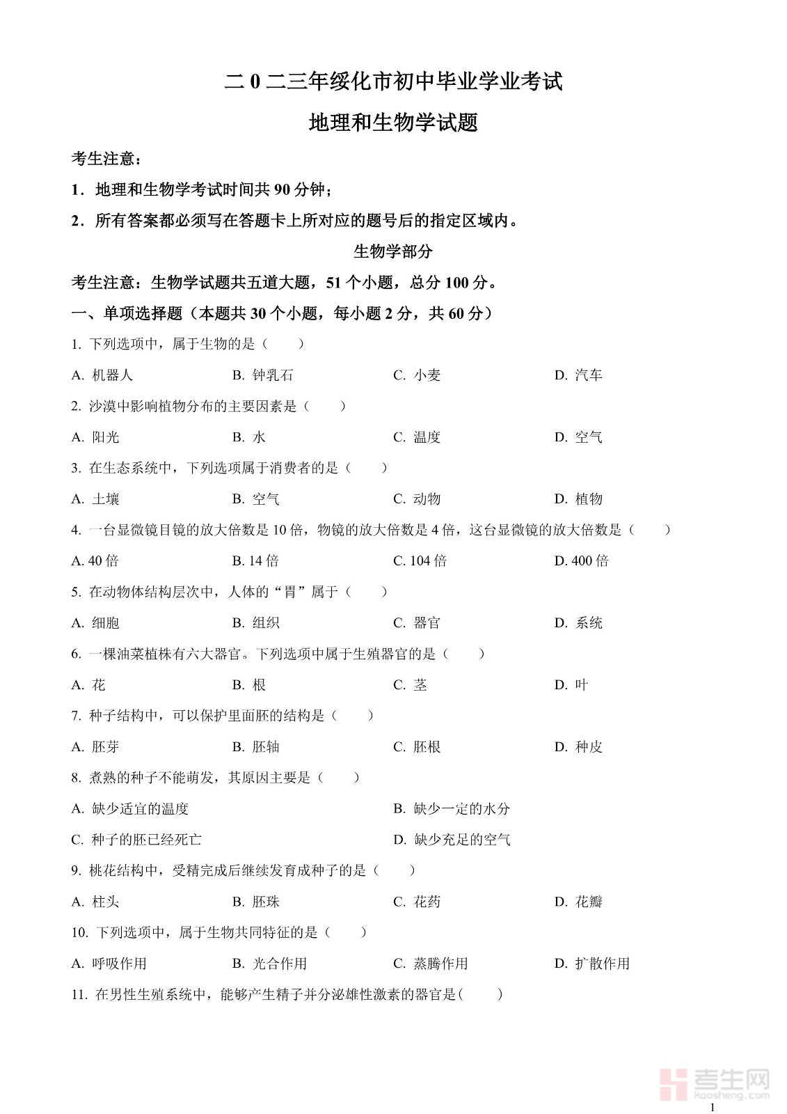 2023年黑龙江省绥化市中考生物真题(原卷版)