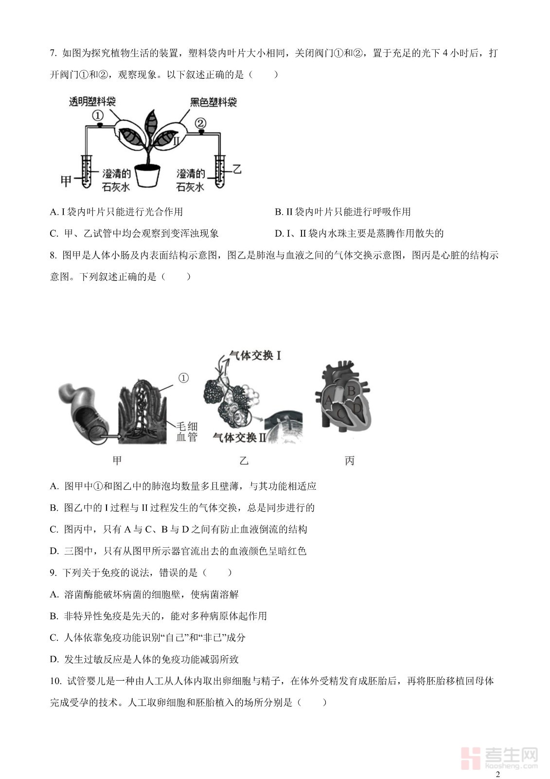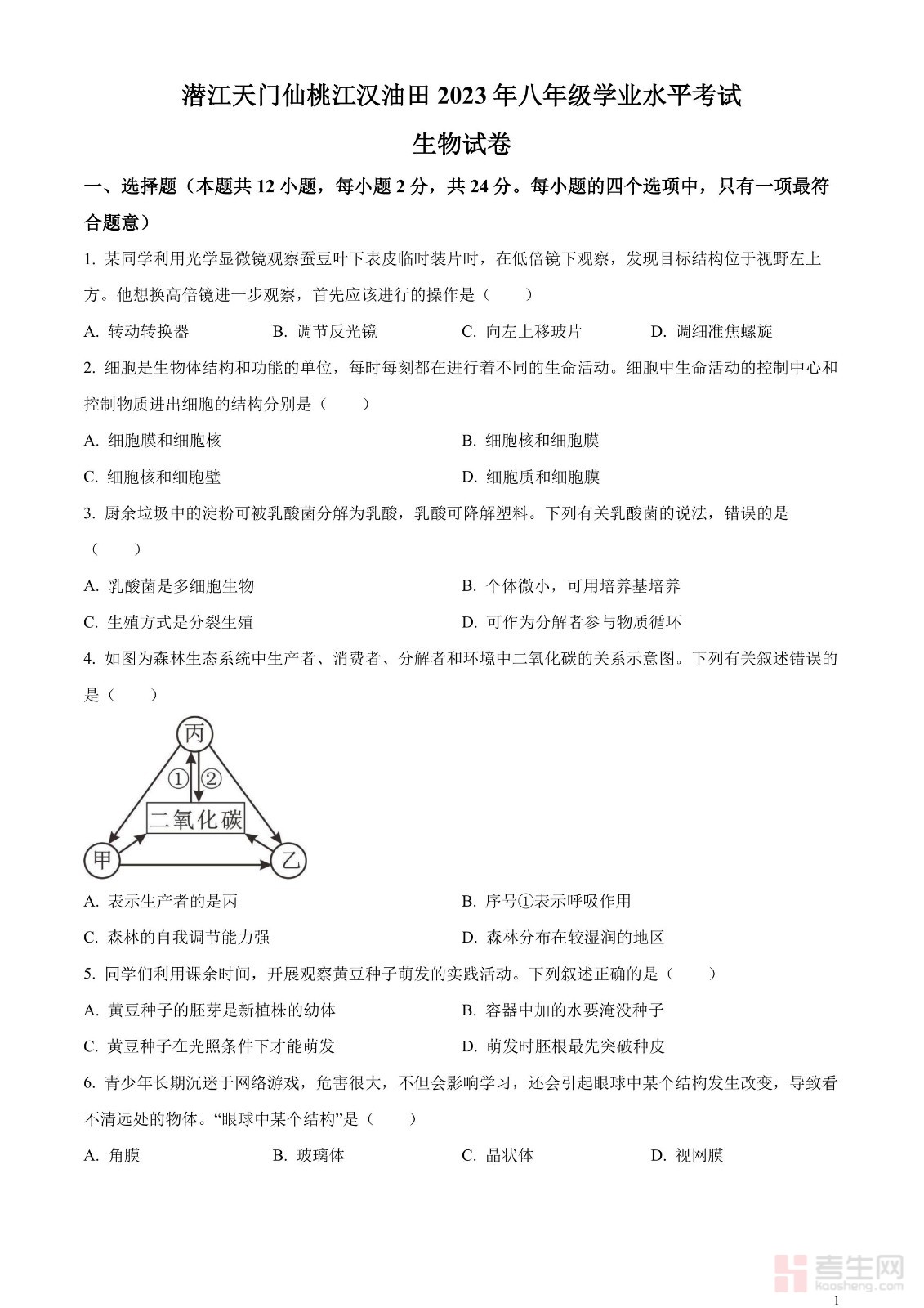 2023年湖北省天门市潜江市仙桃市江汉油田中考生物真题原卷版