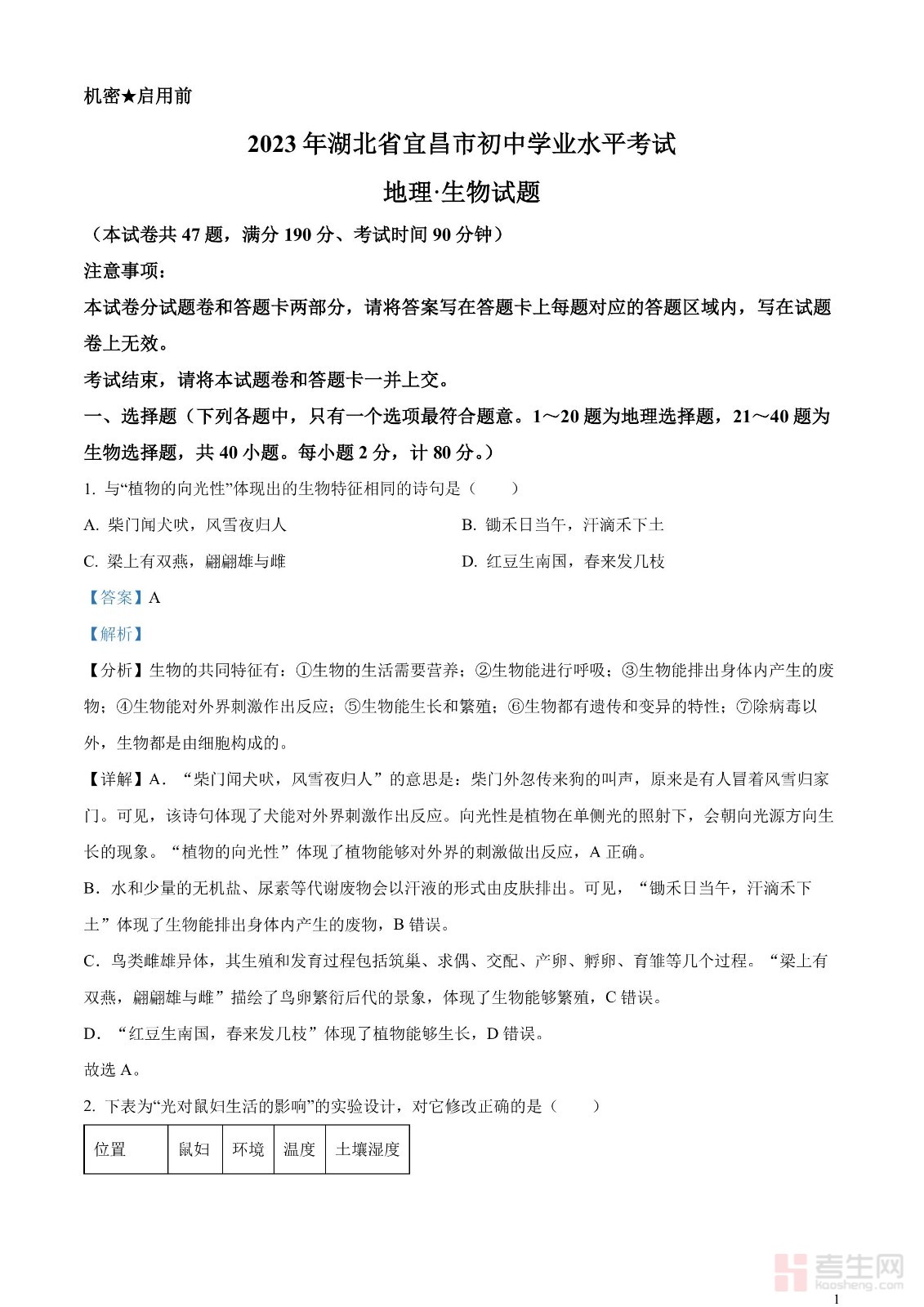 2023年湖北省宜昌市中考生物真题(解析版)
