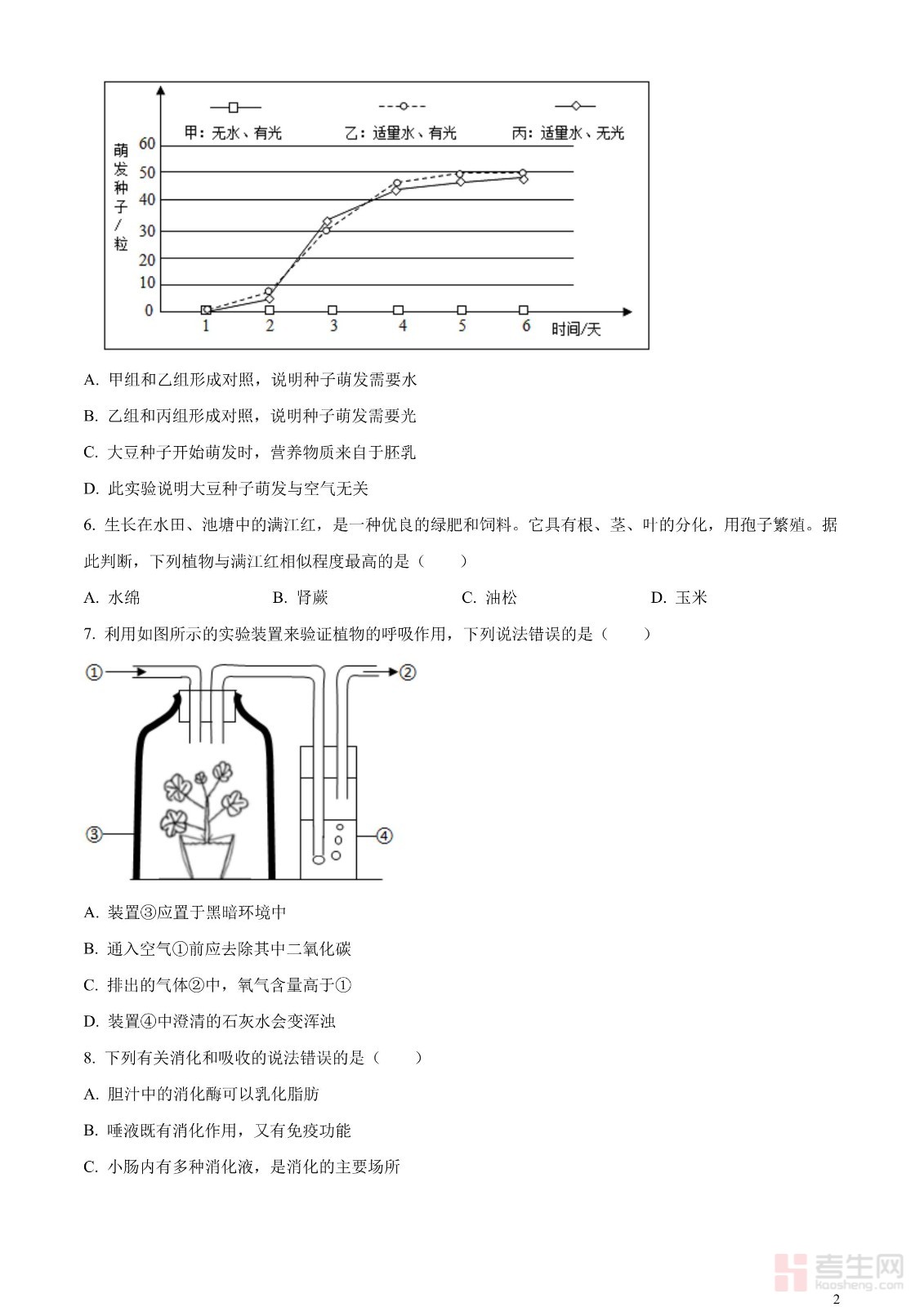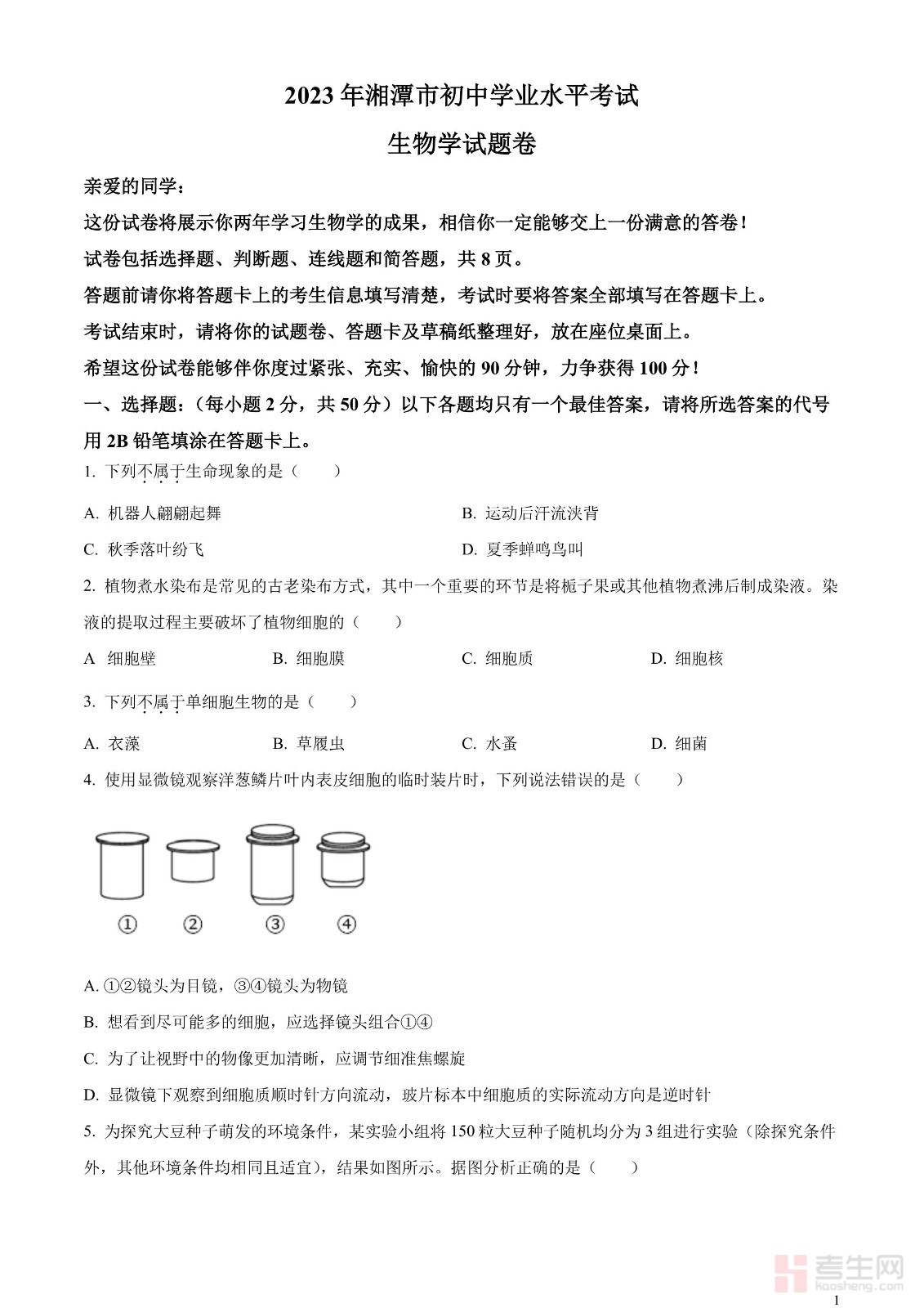 2023年湖南省湘潭市中考生物真题(原卷版)