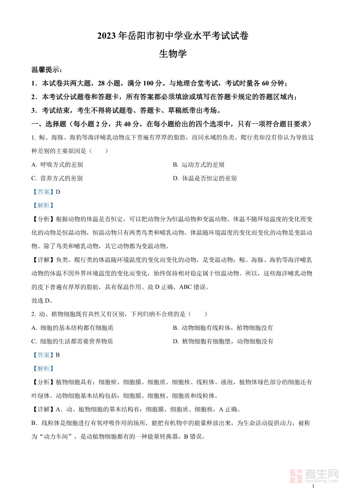 2023年湖南省岳阳市中考生物真题(解析版)