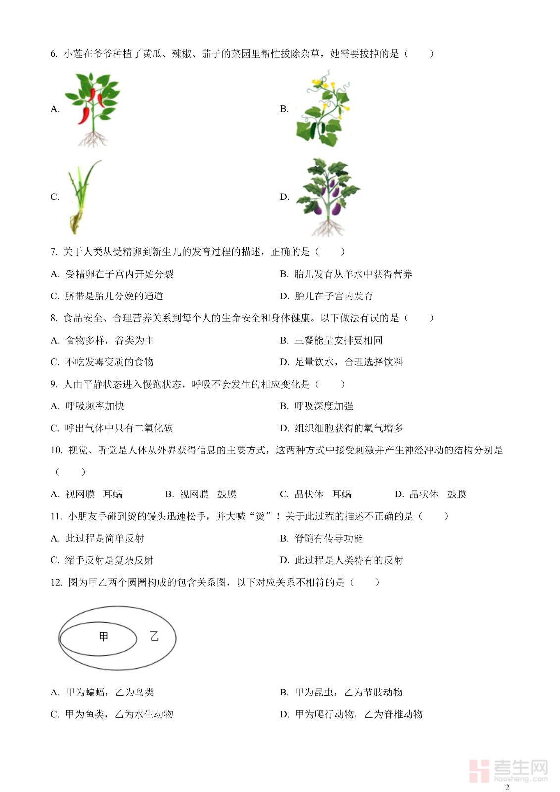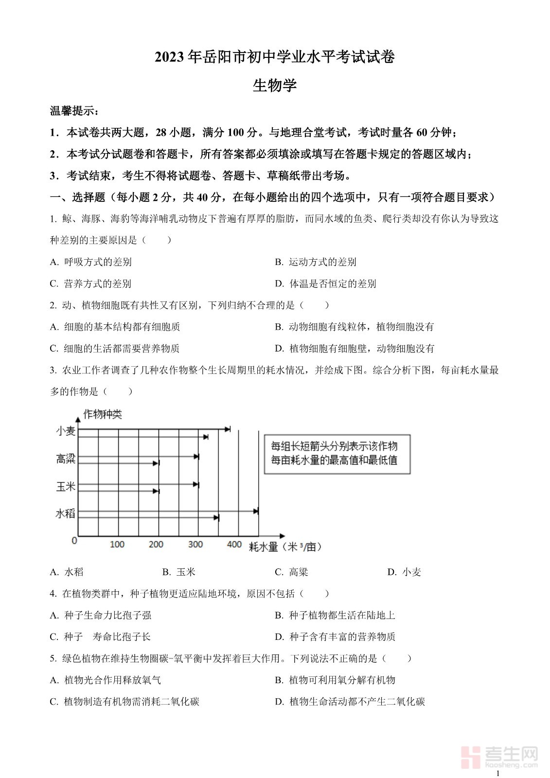 2023年湖南省岳阳市中考生物真题(原卷版)