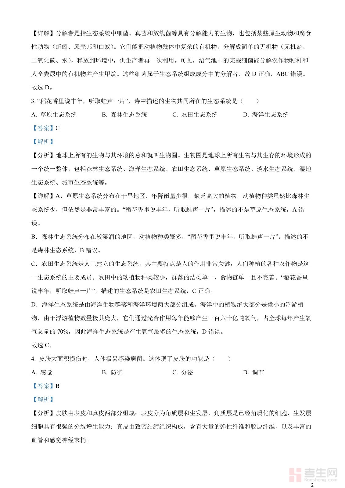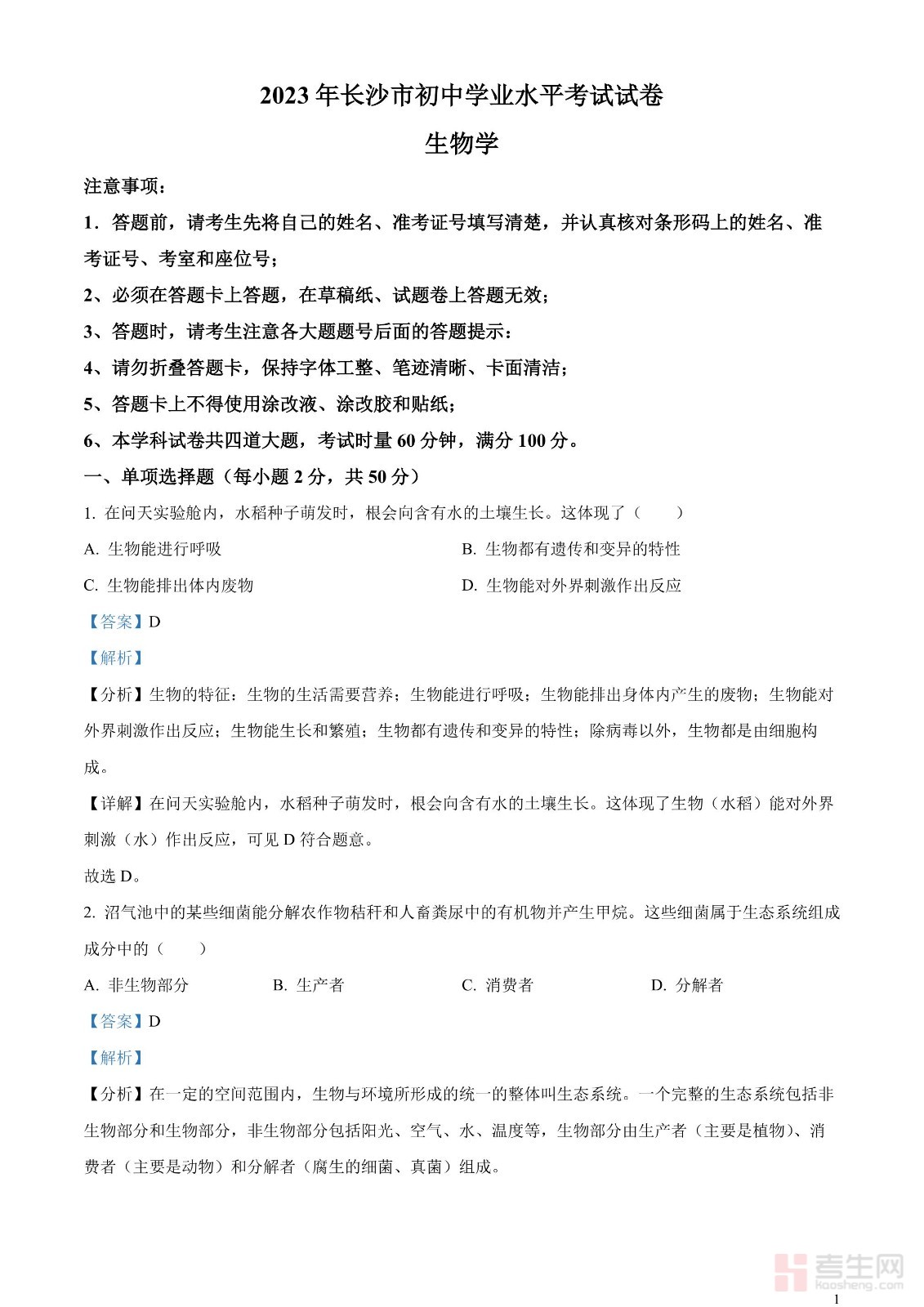 2023年湖南省长沙市中考生物真题(解析版)