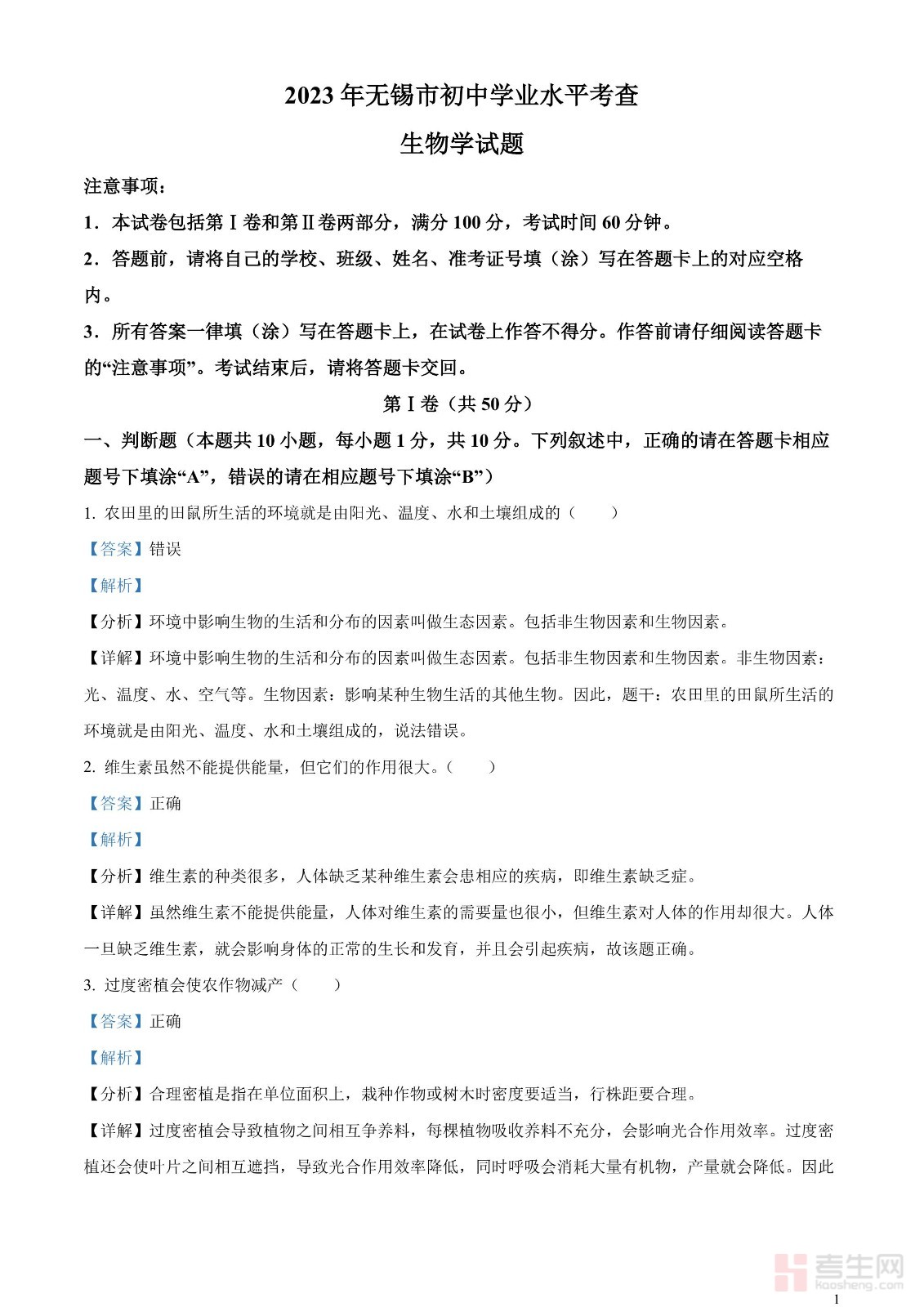 2023年江苏省无锡市初中学业水平考查生物试题(解析版)